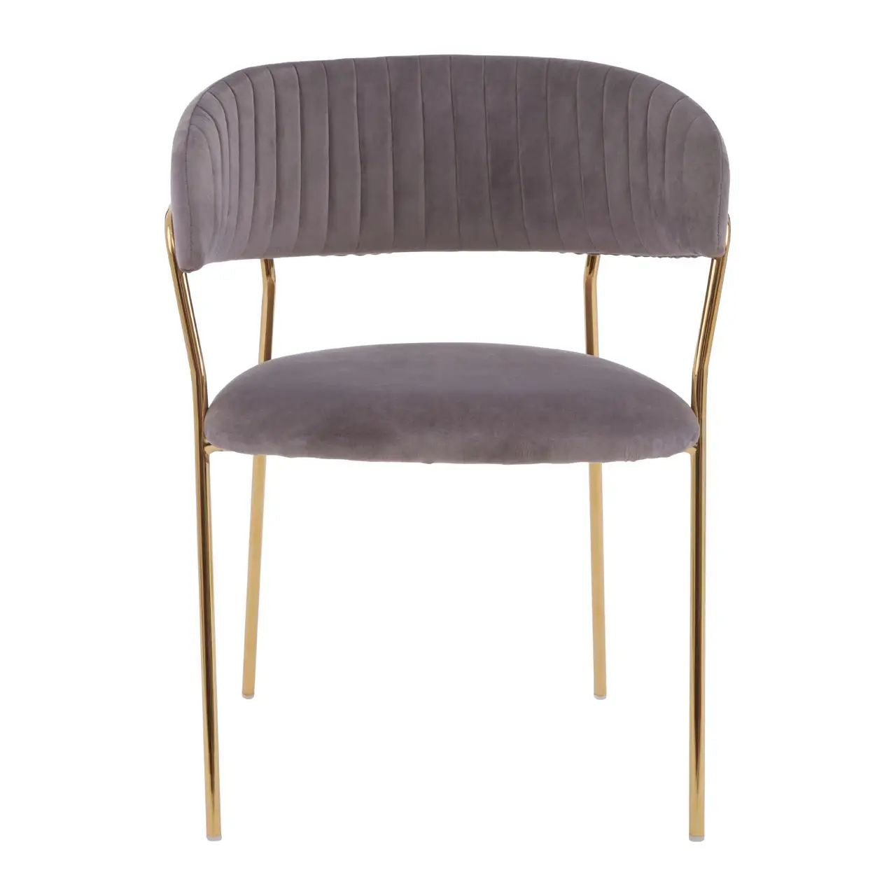 These chairs exude contemporary elegance with its simple, minimalistic gold-finish metal legs. Supporting the padded seat and back upholstered in luxe mink velvet, its angular frame features channel detailing for added texture.