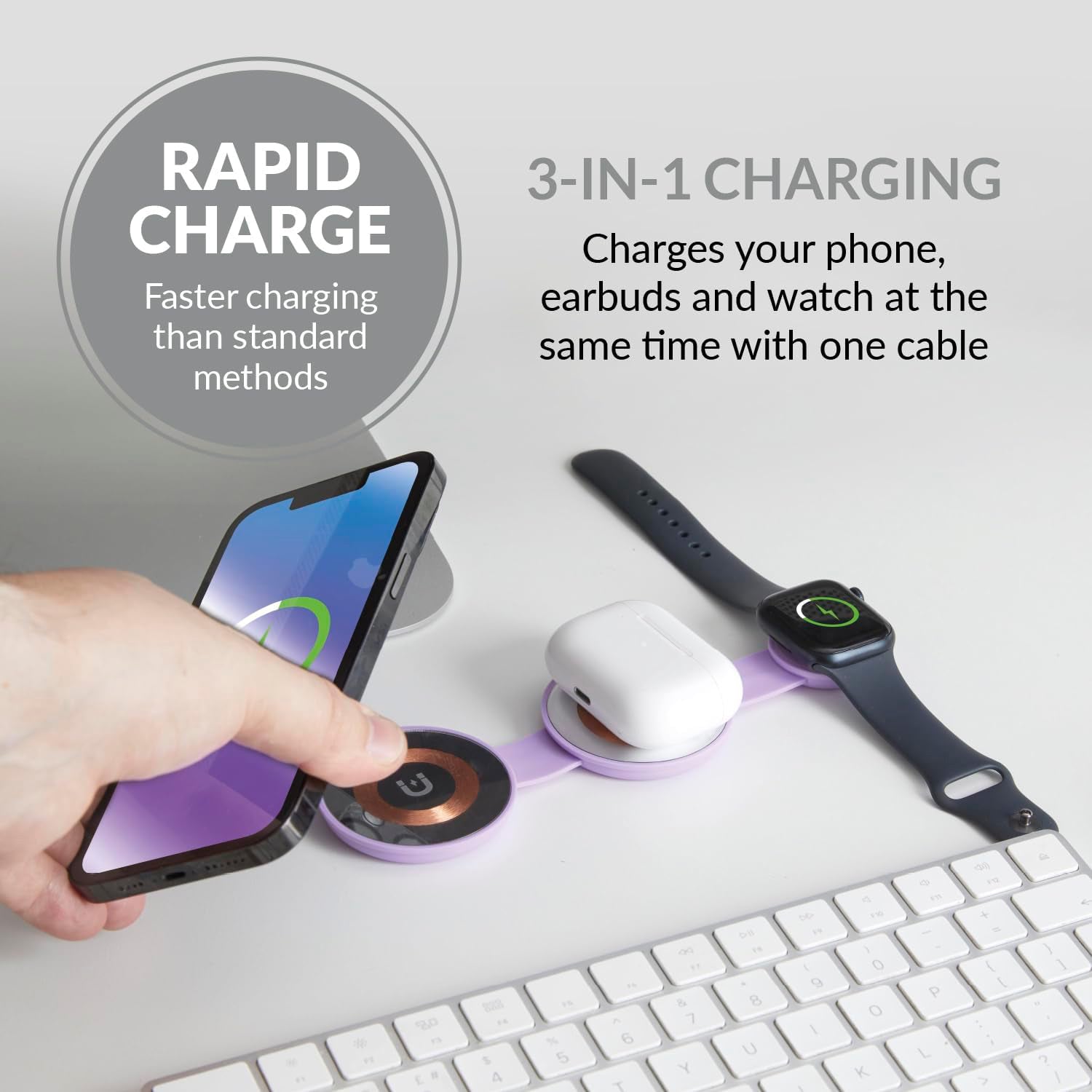 - Includes 1m USB-C charging cable, iPhone charge pad – 15W, AirPods charge pad – 5W, Apple Watch charge pad – 2.5W