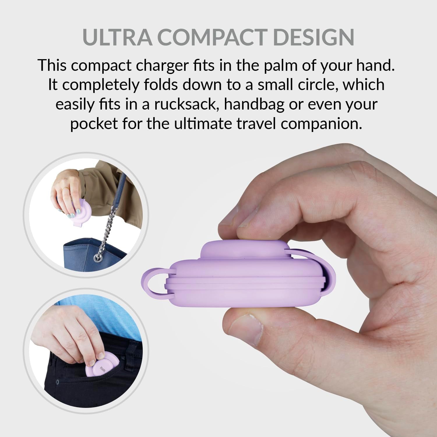 - It’s ultra compact, lightweight and fully foldable so it fits in the palm of your hand. You can place it in a rucksack, handbag or even your pocket.