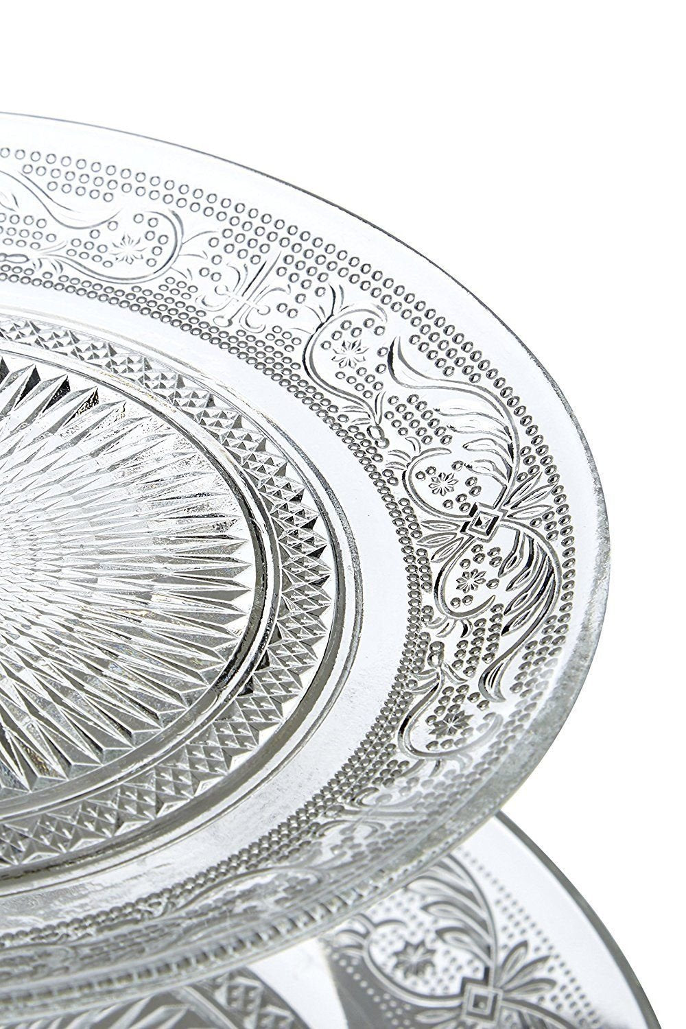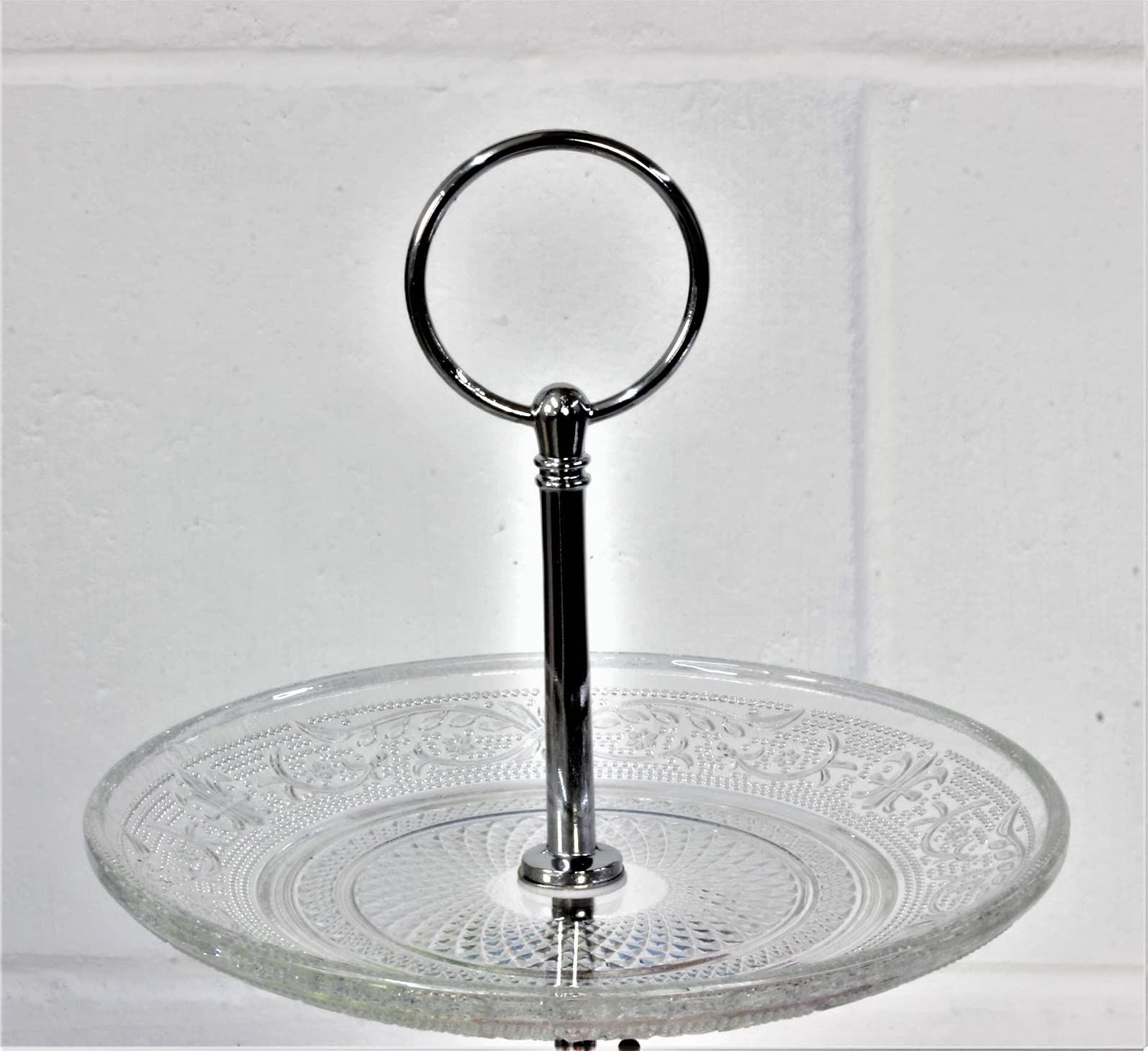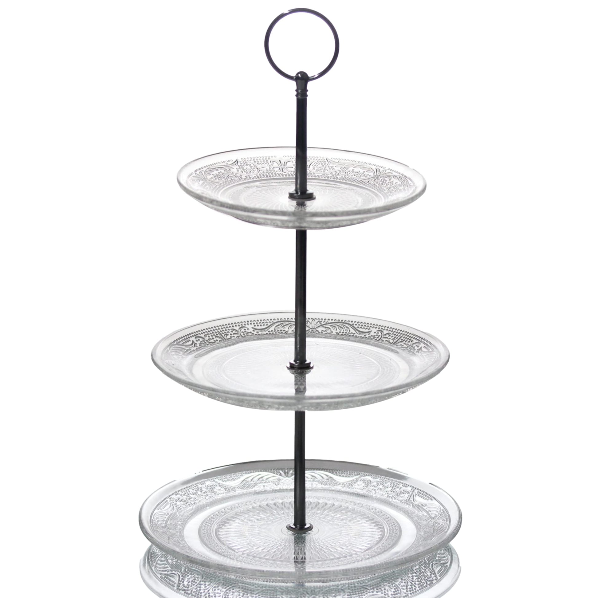 Ideal 3 tier glass cake stand for weddings, birthdays, anniversaries and parties. This is also perfect for afternoon tea session. Made from durable clear glass with embossed detailing. 3 different sized plates: Top 15 x 1.5cm, Mid 18 x 1.8cm, Bottom 20 x 1.8cm. Approx 31.5cm Height. Assembly instructions included.