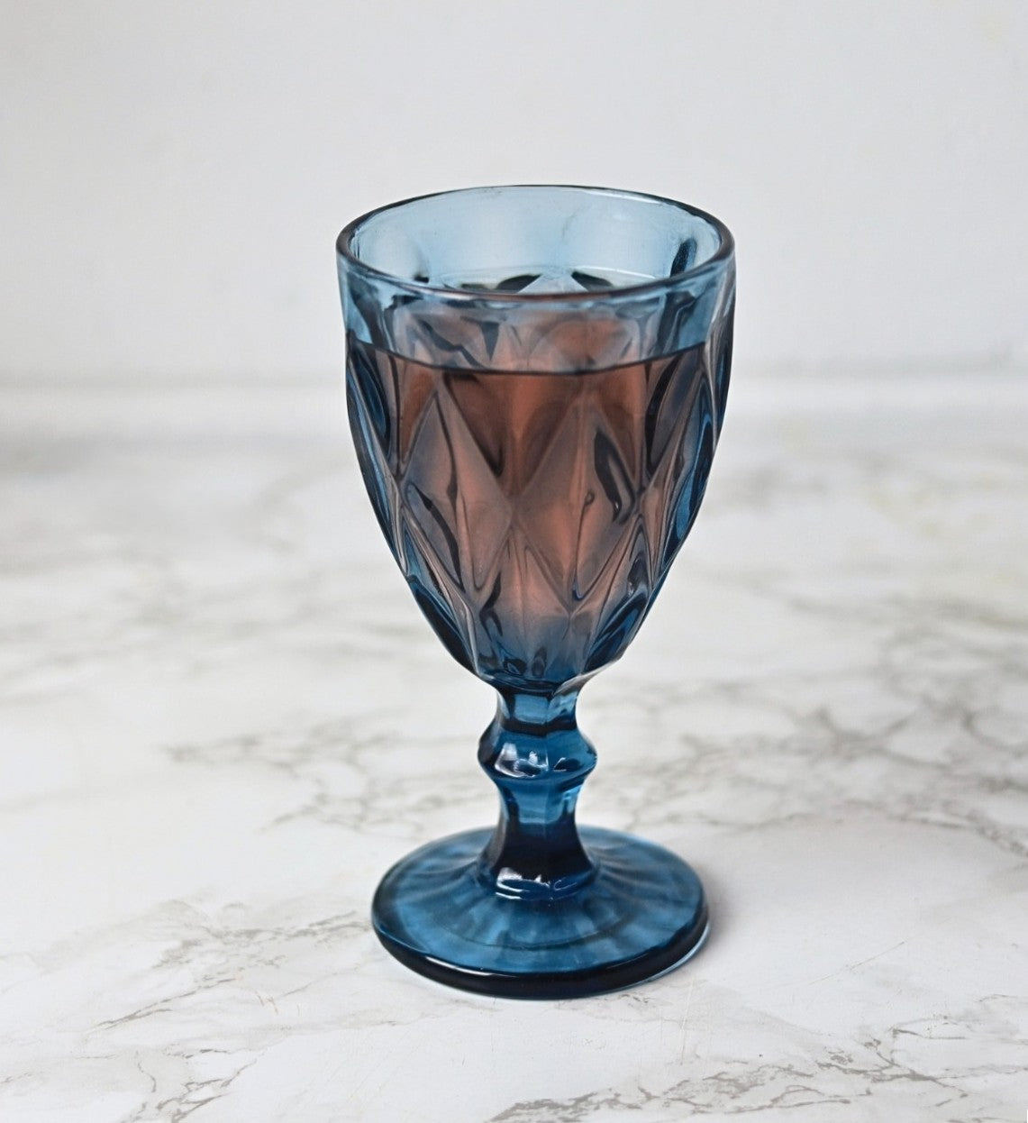 This elegant 300ml chalice-style glass features a cut-glass design in a sophisticated blue colour. It's ideal for serving wine, cocktails, or water in refined style.