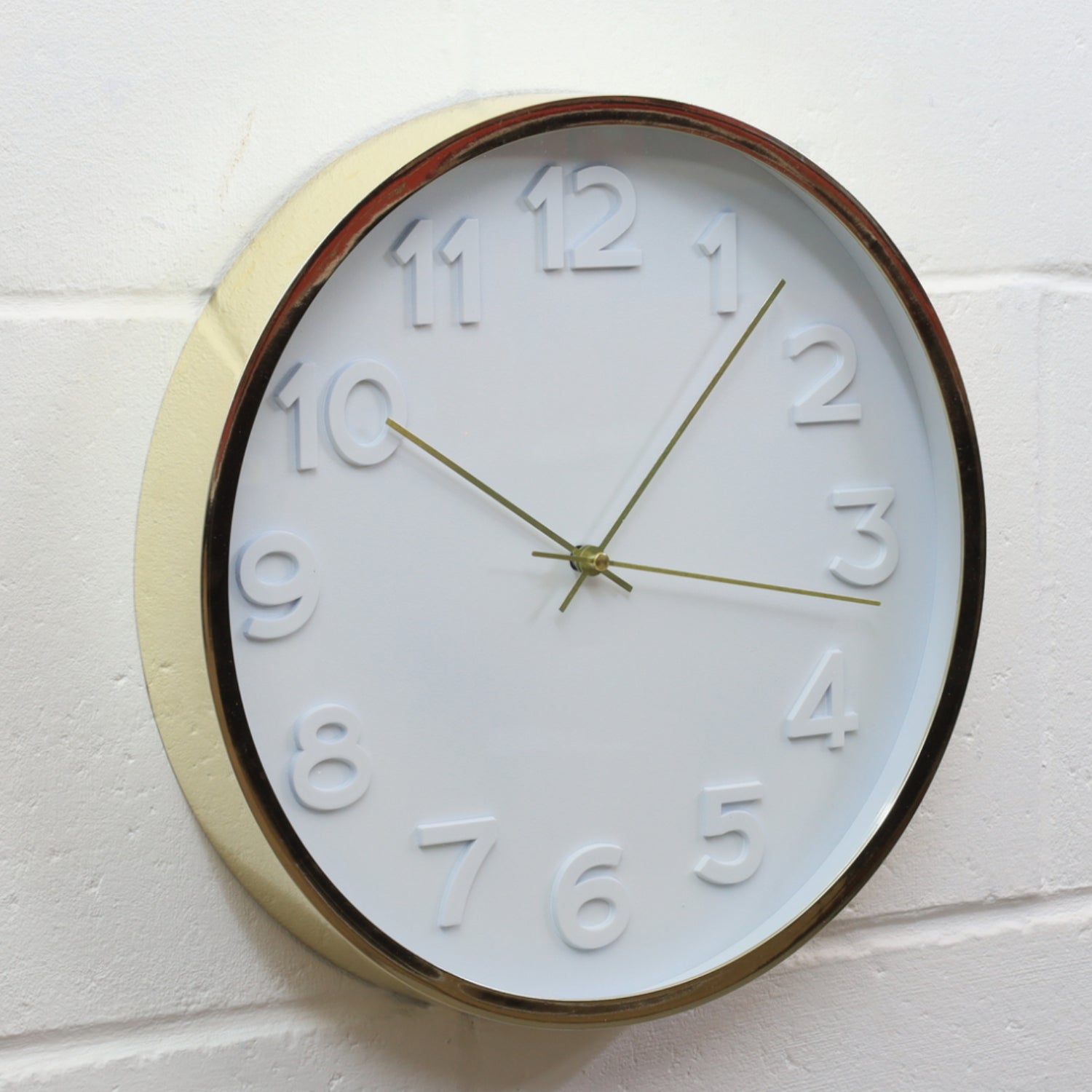 This 30cm round gold rim wall clock features raised Arabic numerals and an elegant analogue display. Battery-powered, it's perfect for kitchens, offices, or living rooms.