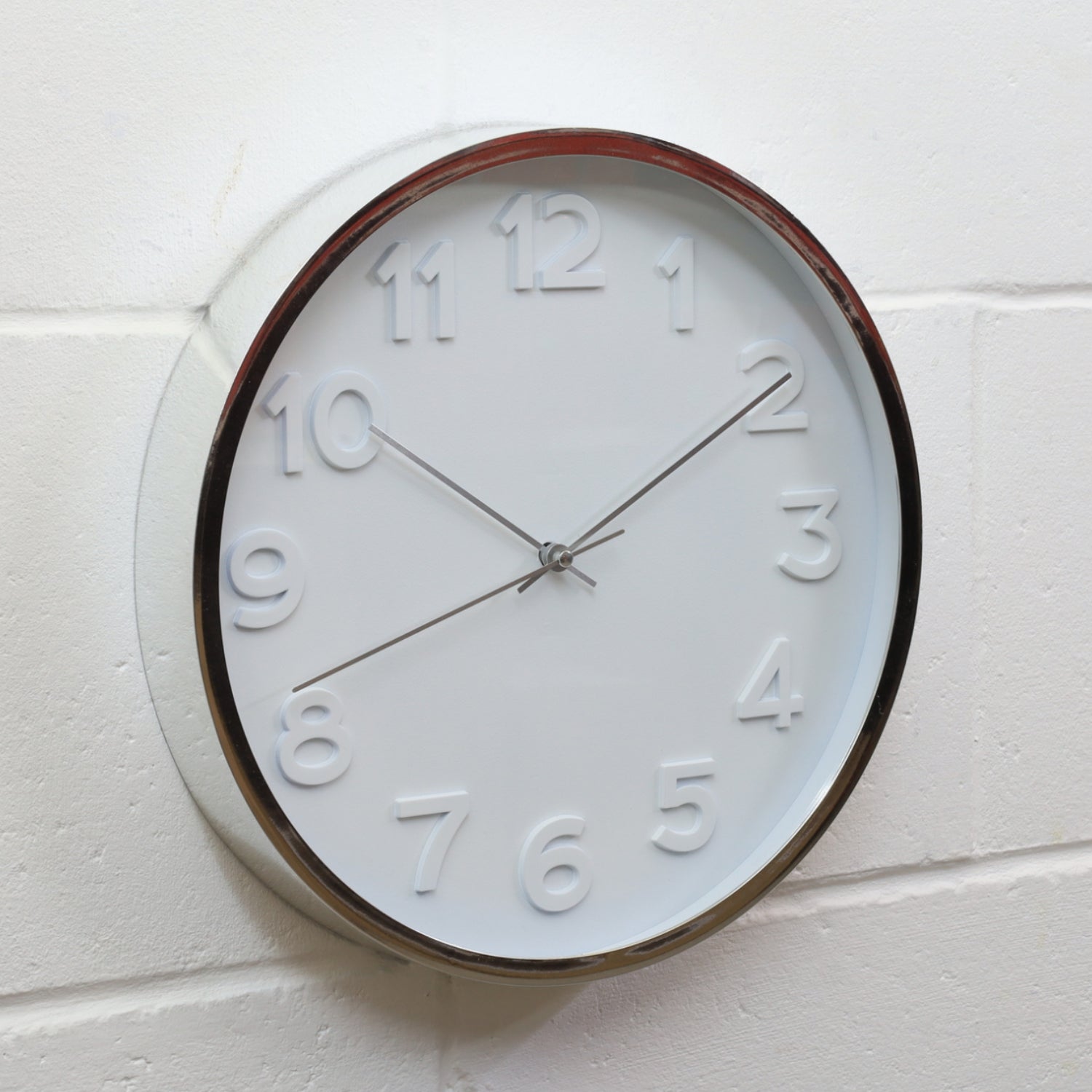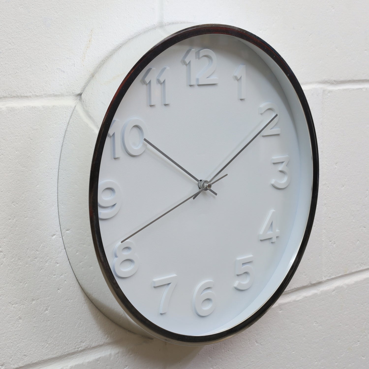 This 30cm round silver rim wall clock features raised Arabic numerals and an elegant analogue display. Battery-powered, it's perfect for kitchens, offices, or living rooms.