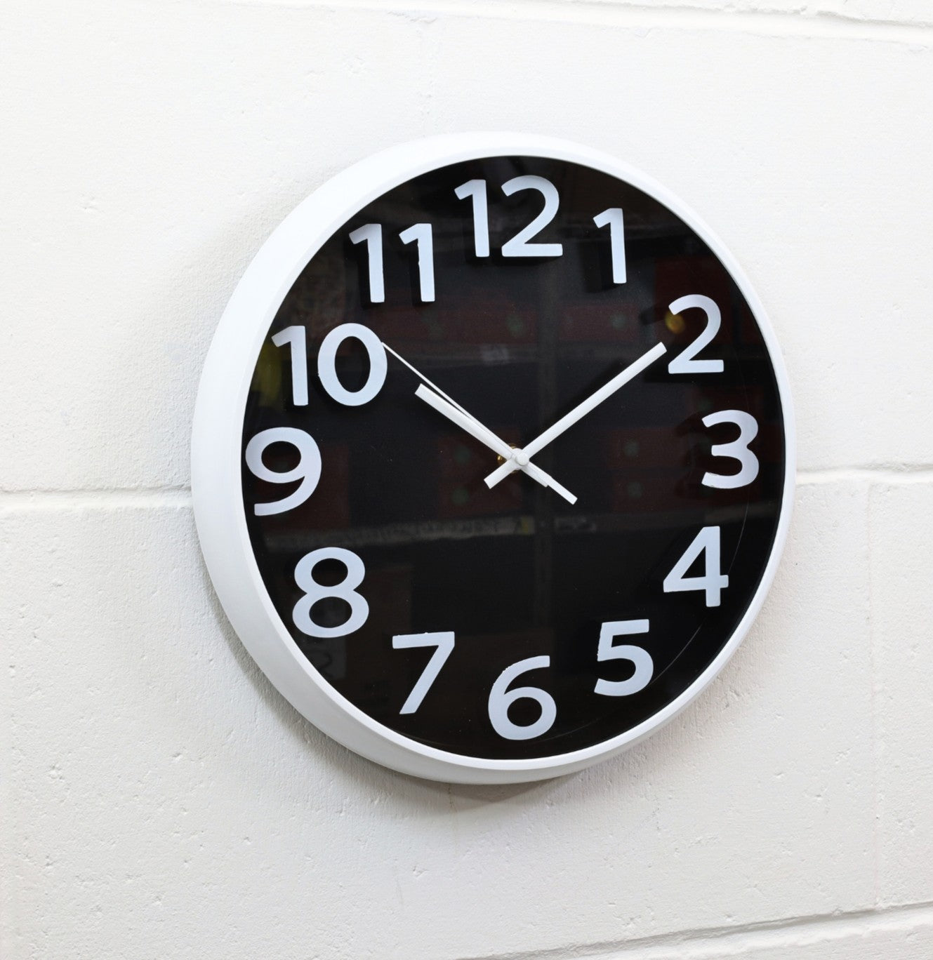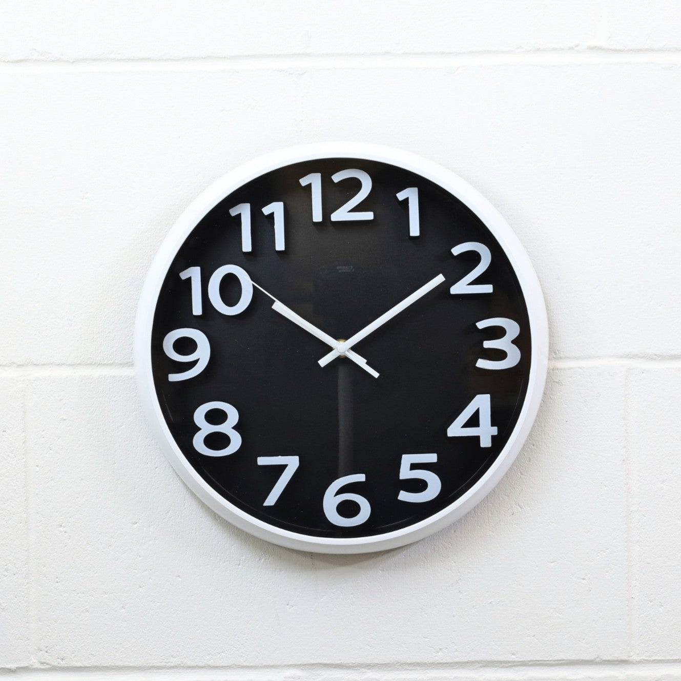 This 30cm round wall clock features a clean white dial with bold white Arabic numerals and a matching black background. Made of durable plastic, it offers easy time reading with a 12-hour format and runs on a single AA battery (not included).