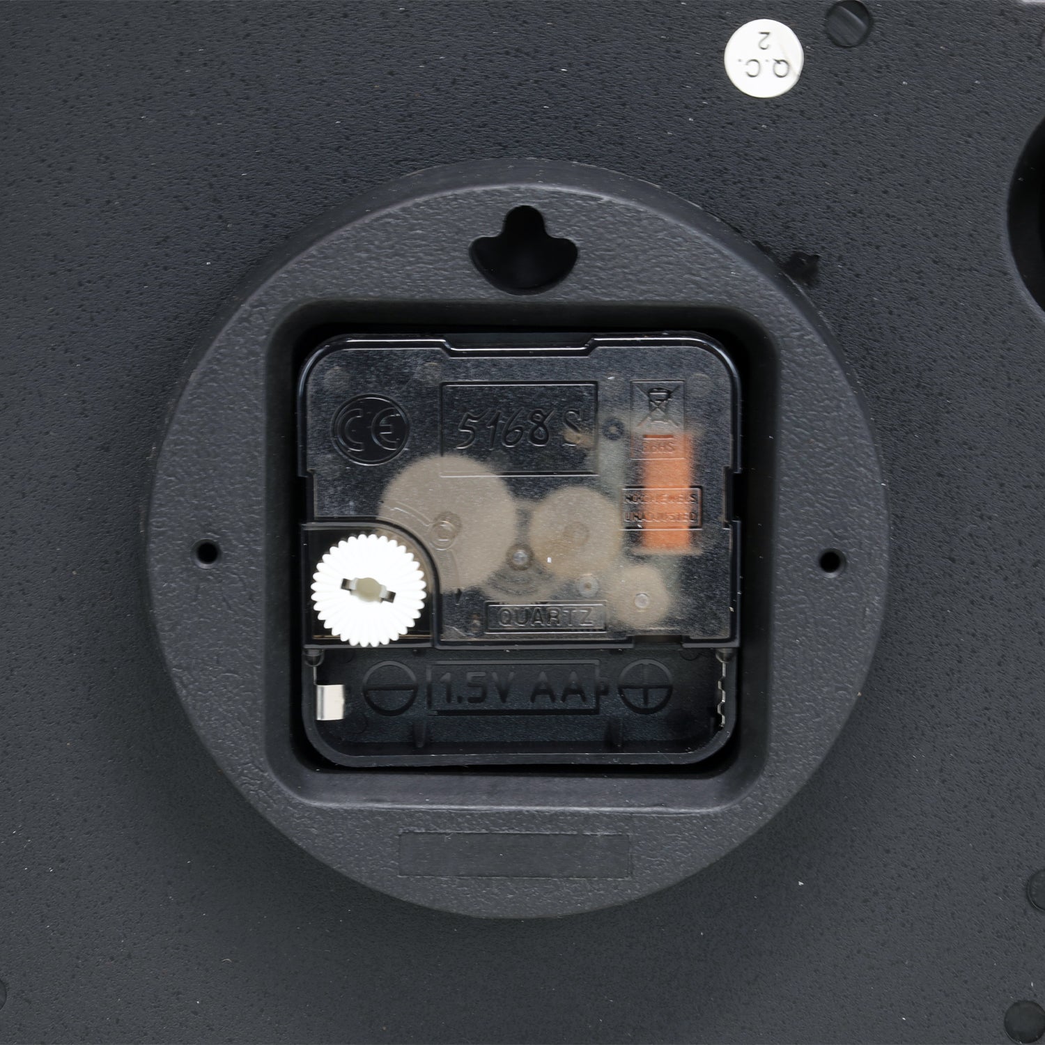 - Round shape with a black background and matching white Arabic numerals and hands.
