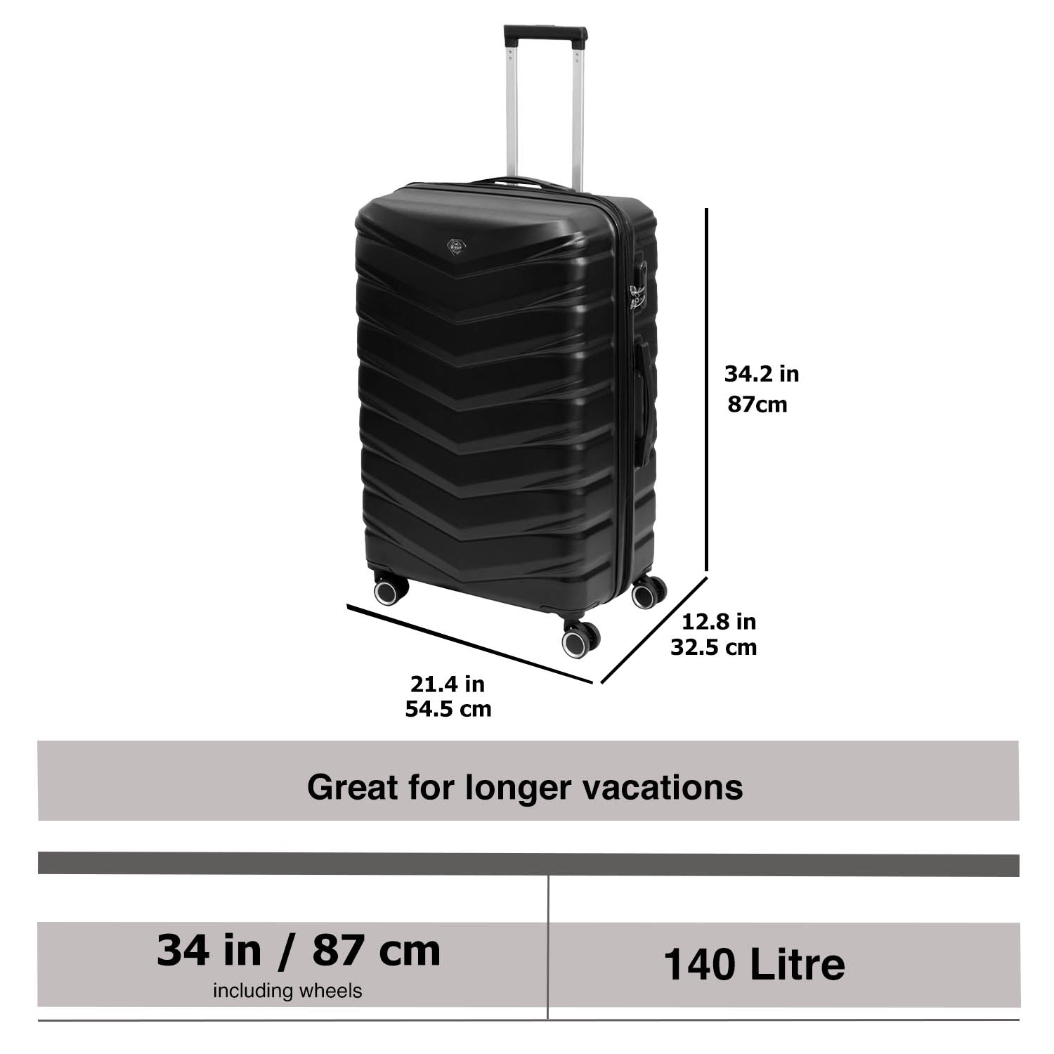 - Suitcase Size - With Wheels: H: 87 x W: 54.5 x D: 32.5cm / Without Wheels: H: 82 x W: 54.5 x D: 32.5cm / Capacity: 140 Litre / Weight: 4.6kg (10.1 lbs)