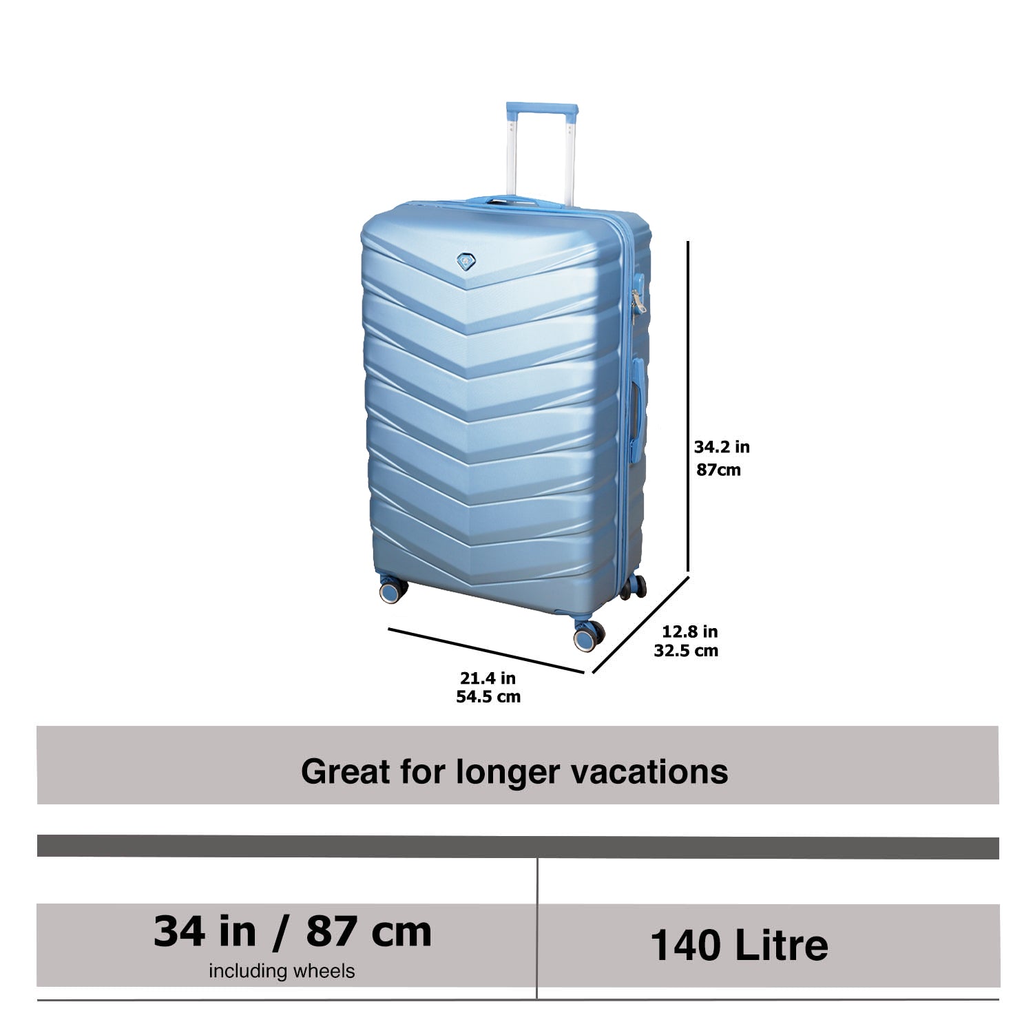 - Suitcase Size - With Wheels: H: 87 x W: 54.5 x D: 32.5cm / Without Wheels: H: 82 x W: 54.5 x D: 32.5cm / Capacity: 140 Litre / Weight: 4.6kg (10.1 lbs)
