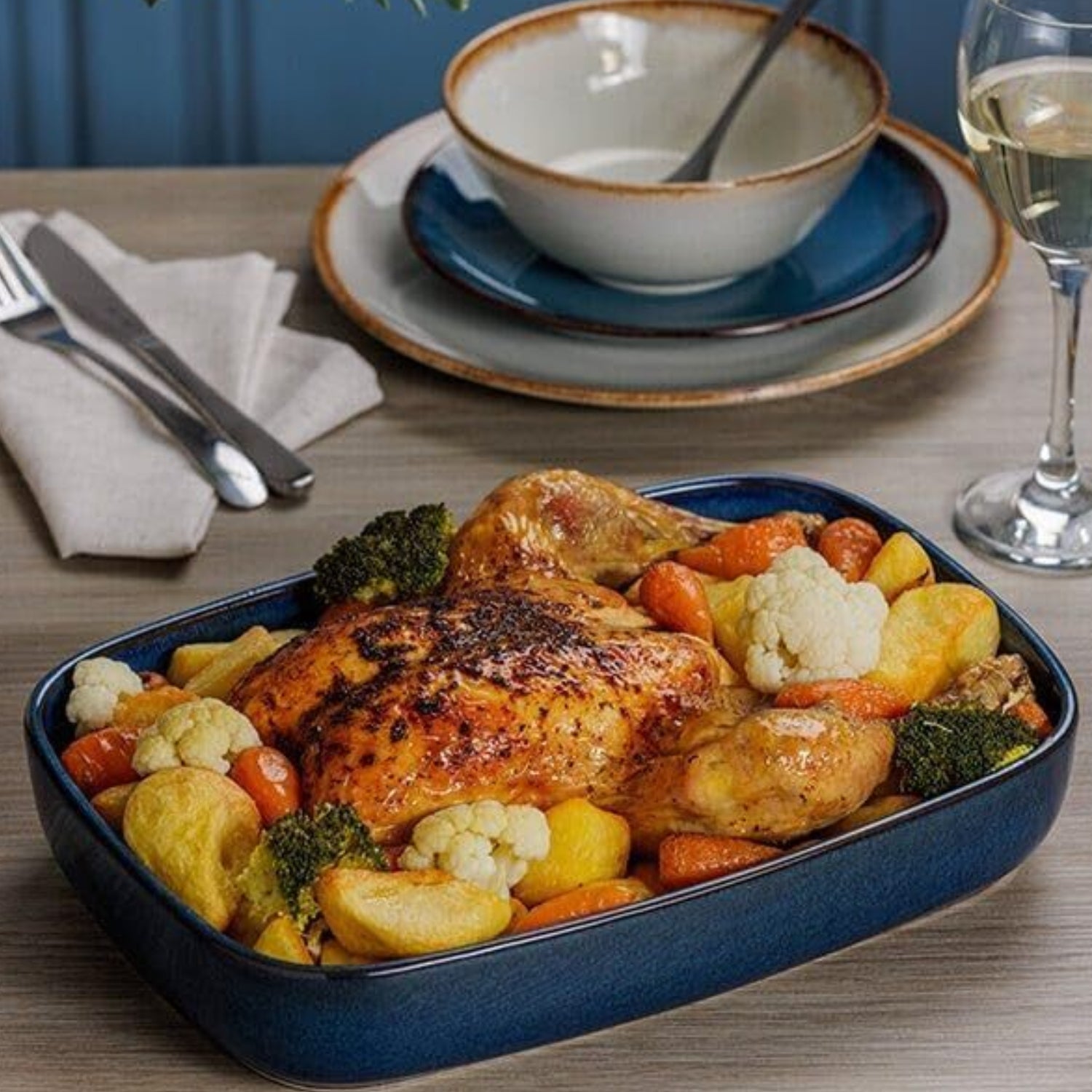 The stunning Reactive Blue oven-to-tableware collection seamlessly blends functionality and style. The ovenware is crafted with a reactive blue glaze with a unique, one-of-a-kind finish, making them a distinctive addition to the tableware.