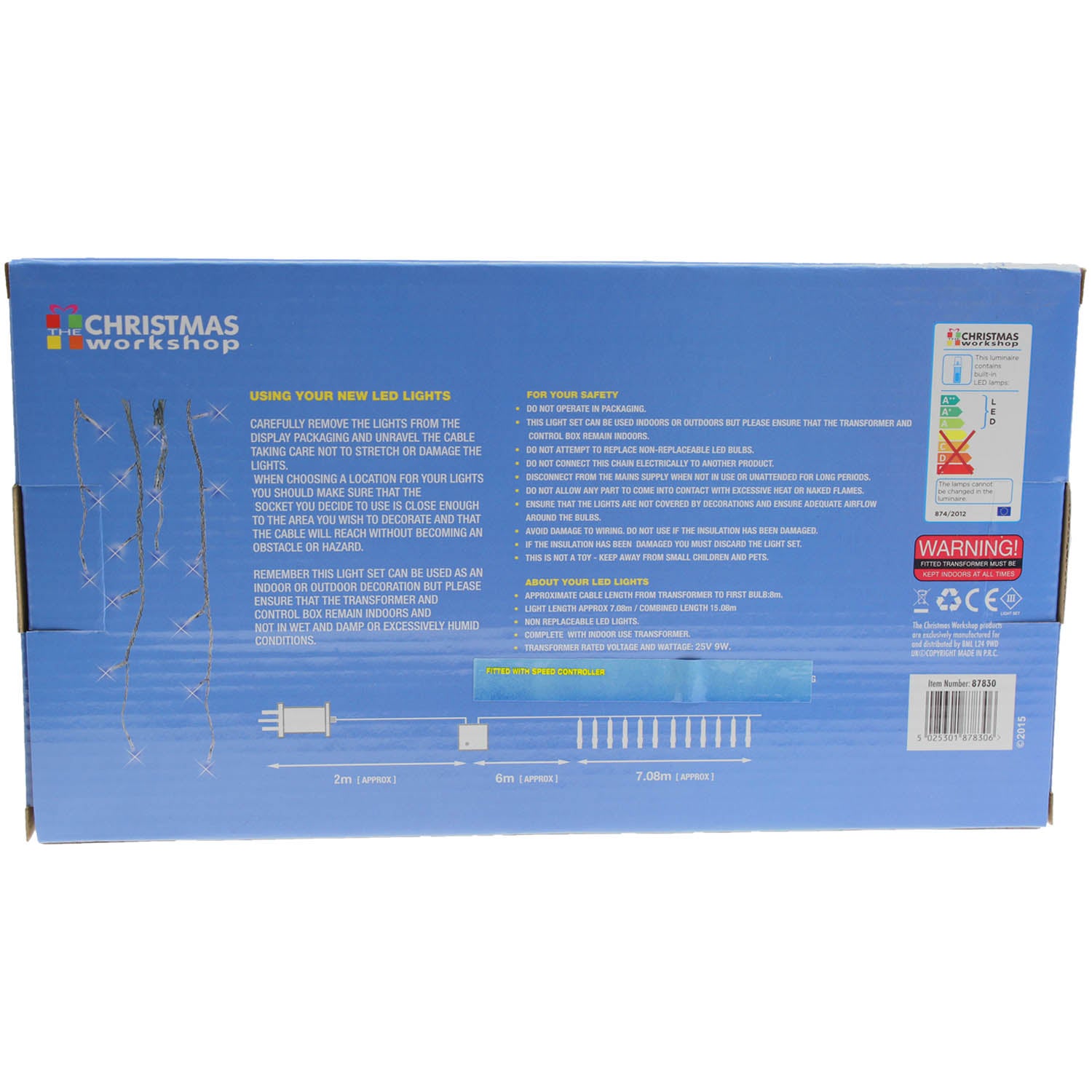 360 blue snowing icicle lights with ultra bright LED. These blue snowing icicle lights use LED bulbs which are energy efficient and are long-lasting. Can be used indoor or outdoor and fitted with speed controller. This light set can be used as an indoor or outdoor decoration but please ensure that the transformer and control box remain indoors and not in wet and damp or excessively humid conditions. The term snowing means that these icicles lights turn off and on in a downward pulse to give an effect that looks like it is snowing. Approximate cable length from transformer to the first bulb: 8 metres. Light length approximativ.