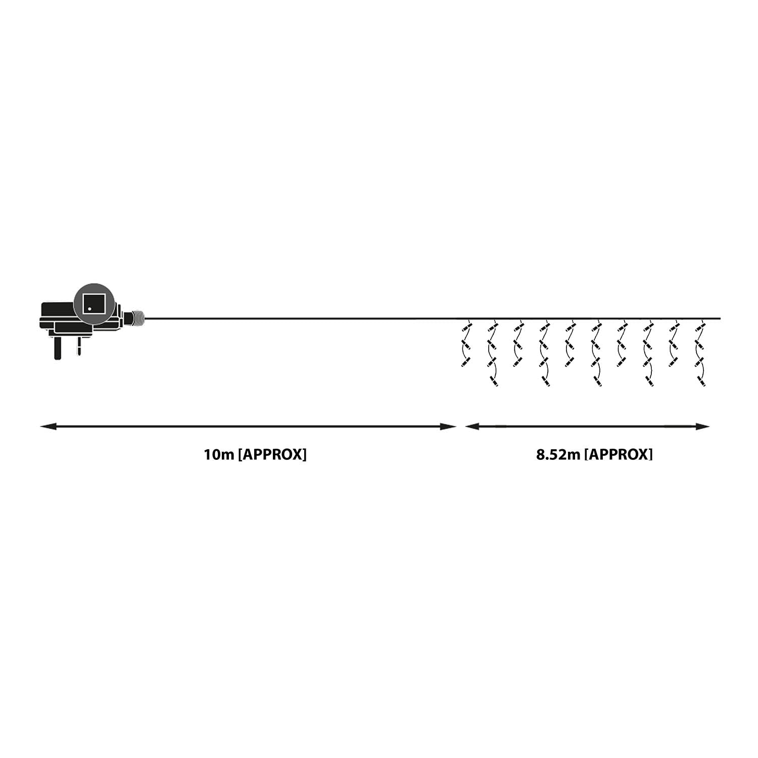 - Light length: 8.52m, Lead wire: 10m, Combined length: 18.52m, 12cm Icicle Drop, 8cm Gap Between Icicles. Mains power operated.