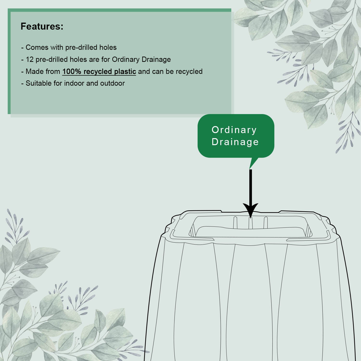- Drill hole guides in base for ordinary and reservoir overflow.