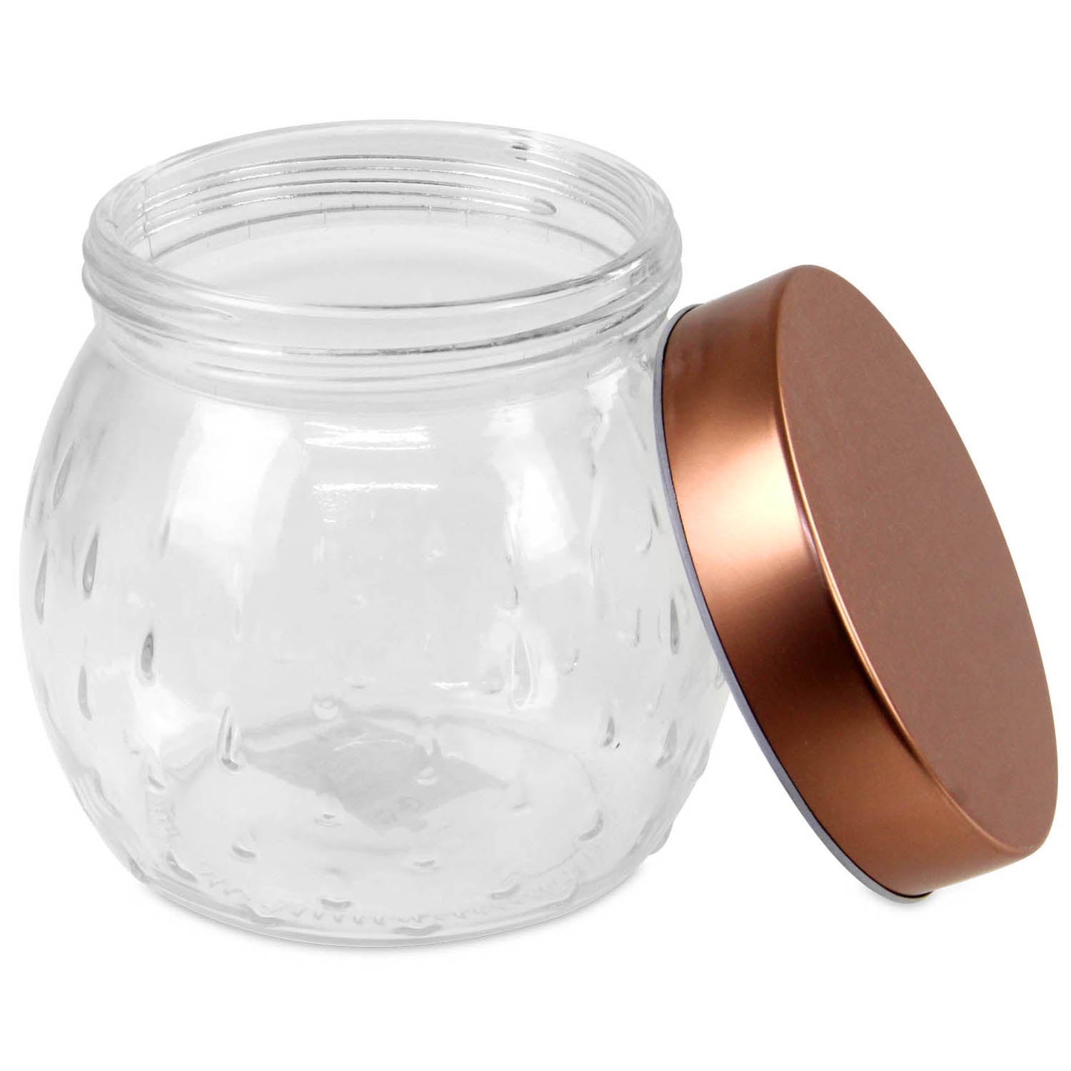 These set of 3 embossed glass jar is your best container and food storage. The copper painted screw-top lid is designed with an airtight lock seal. Ideal to store dry food and grains such as tea, coffee, sugar, rice, pasta and more.