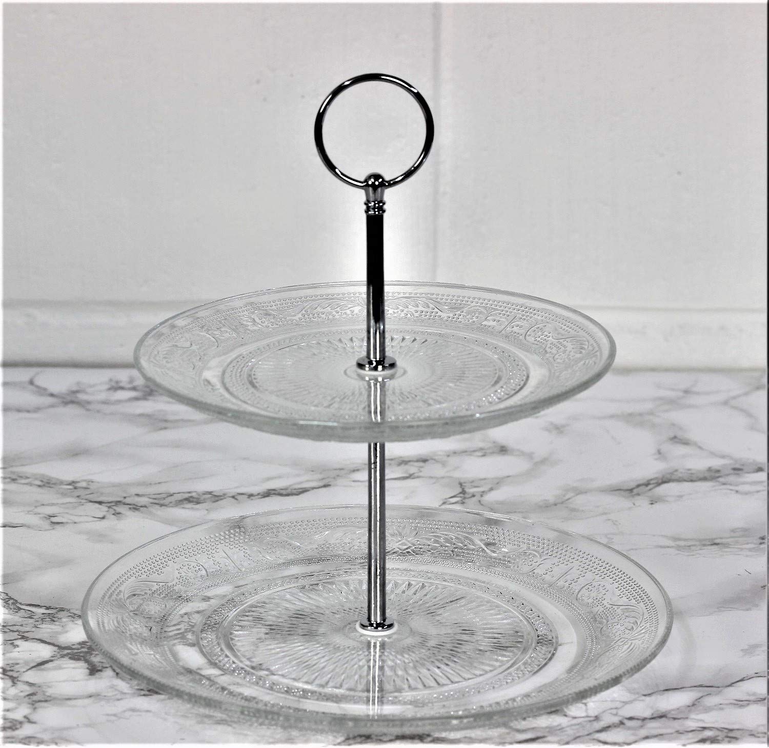 - Two tiers provide ample space to display and serve cakes, pastries, and desserts