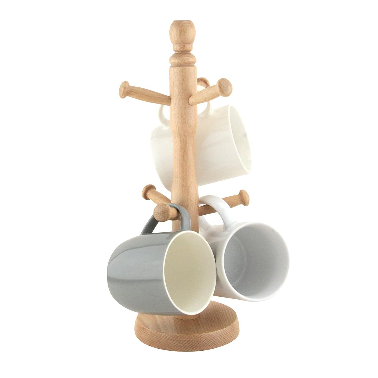 The beech wooden mug tree allows you space to hang six mugs for a stylish addition to your kitchen. It keeps mugs out of the way and ready to use.