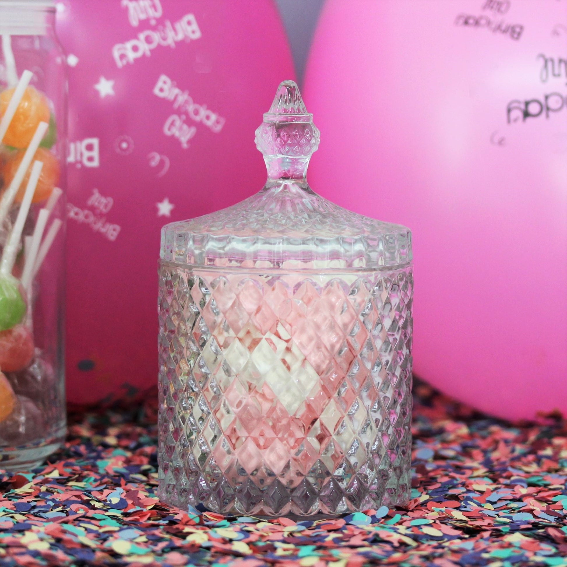 Keep those secret sweet treats securely stored in this glass jar with an easy open/close top lid; perfect for storage of different confectionary in different tiers i.e. sweets, chocolates, candy, bonbons, lollipops, marshmallows, jelly beans, gummy bears, pick & mix, fudge and more.