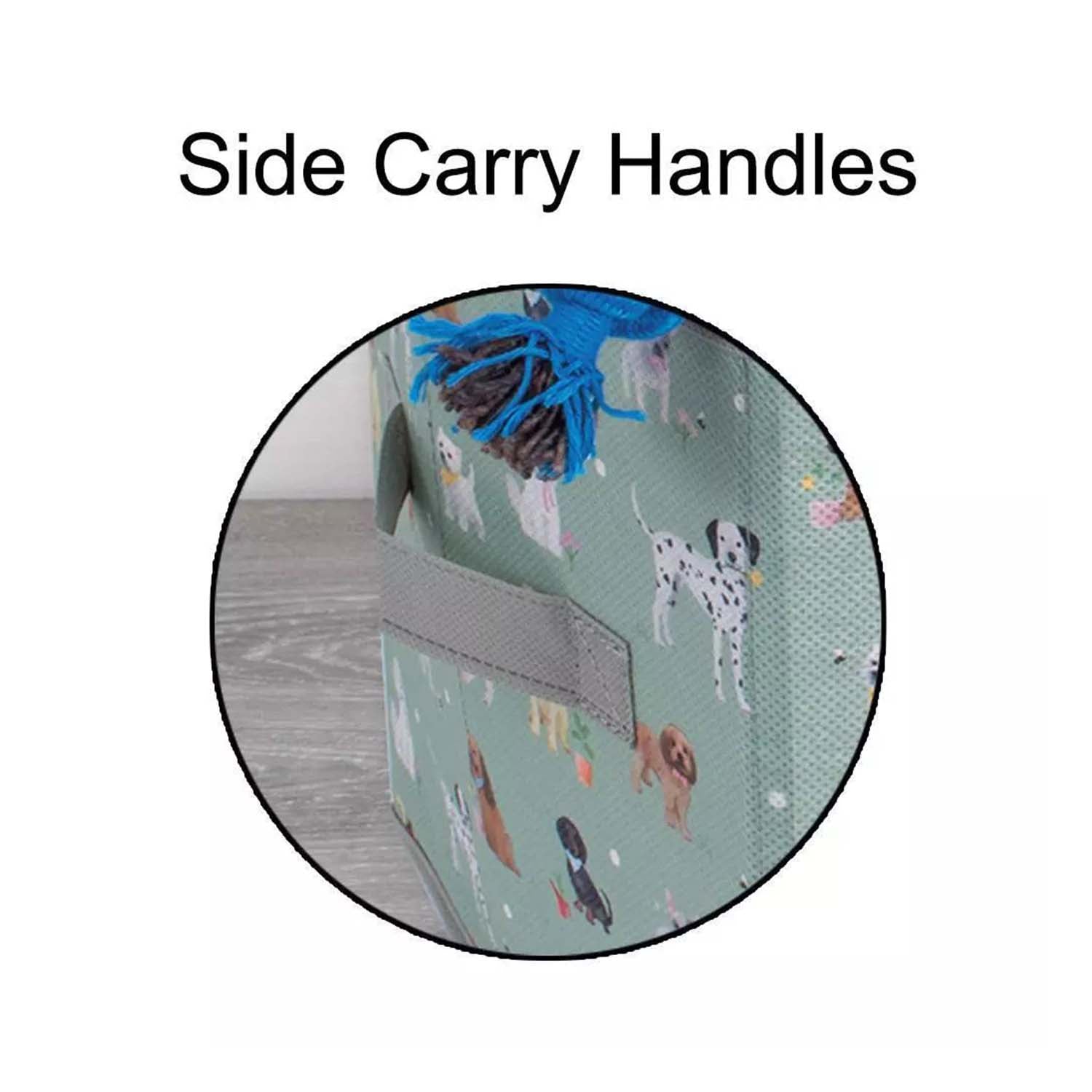 Keep your pet's toys organized with our charming 3pc dog toy storage box set. This green box, adorned with a delightful printed dogs design, is made from durable polyester, ensuring it withstands daily use. The sturdy paperboard base bottom provides added stability, while the foldable design allows it to fold flat for space-saving storage when not in use. With two convenient handles, transporting the box is a breeze.