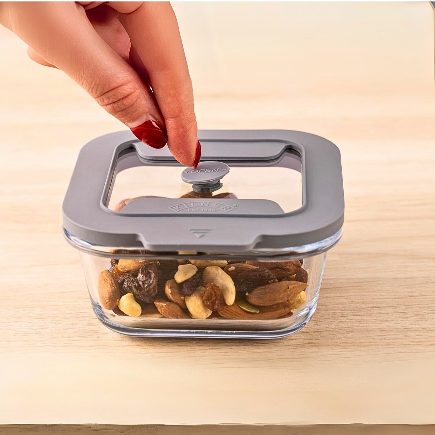 - Made with a durable borosilicate glass base and features a lid equipped with a vacuum seal silicone valve that ensures an airtight seal.