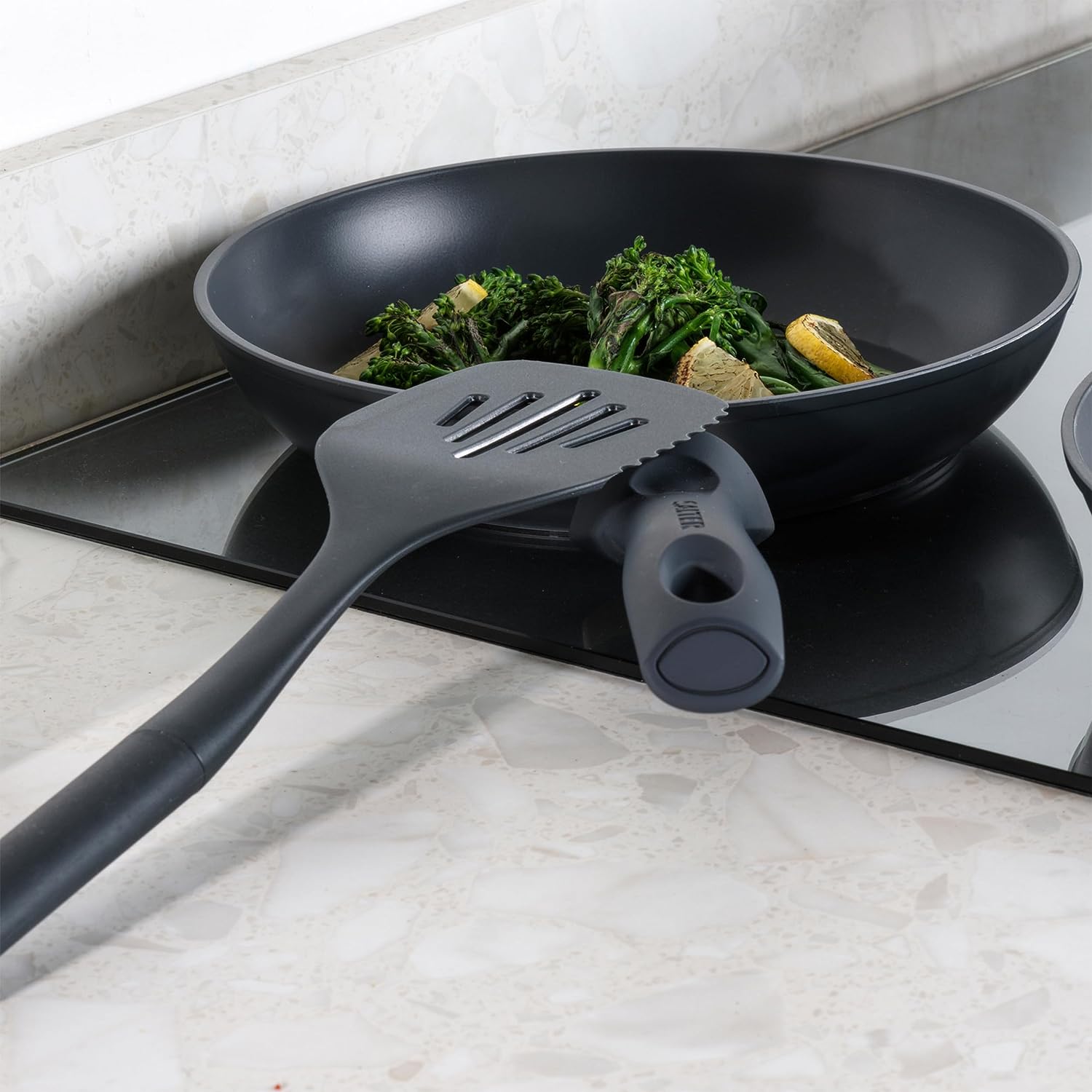 This Salter Marino 3-piece utensil set is the perfect companion for any kitchen, designed with versatility in mind. It includes a slotted spatula, slotted spoon, and solid spoon, each of which is made using heat-resistant nylon for safe cooking. The spatula has a garlic rub and a serrated food separator edge for portioning food in the pan, while the spoons feature an integrated herb stripper. Suitable for use on non-stick pans, the utensils also feature hanging hooks for convenient storage.