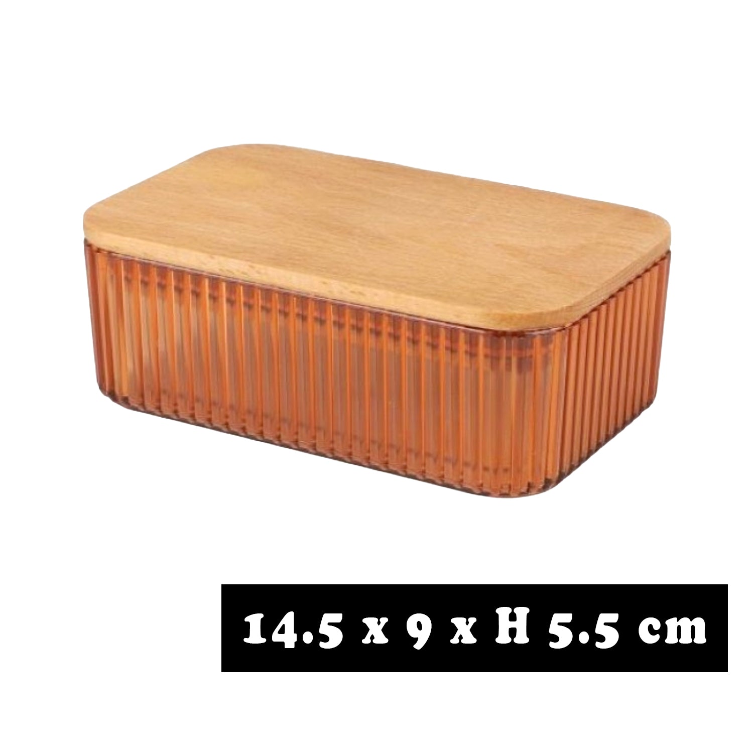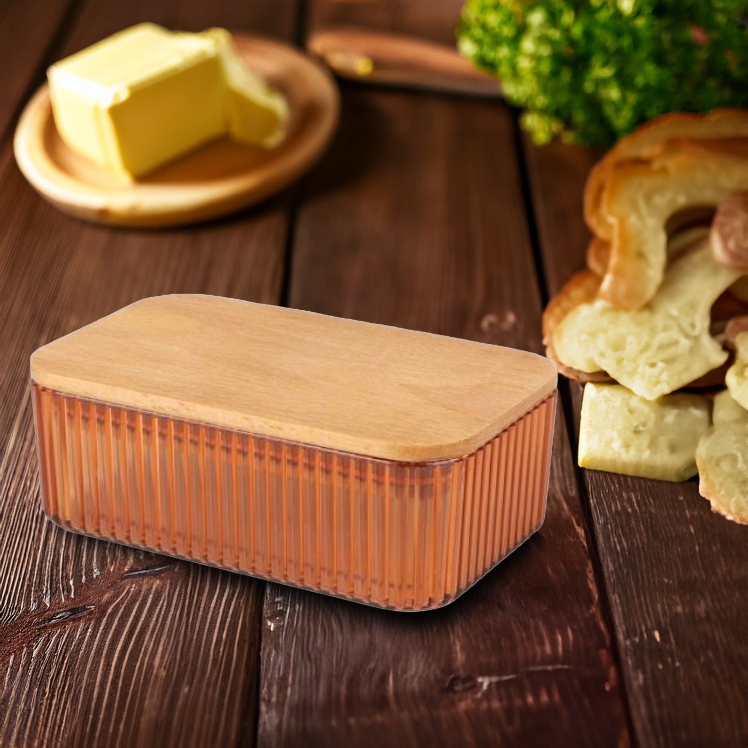 The Samba Butter Dish is a versatile food storage box that keeps butter, cheese, and other small food items fresh. It features a transparent orange ribbed plastic base and a natural wooden lid, combining functionality with a stylish look.
