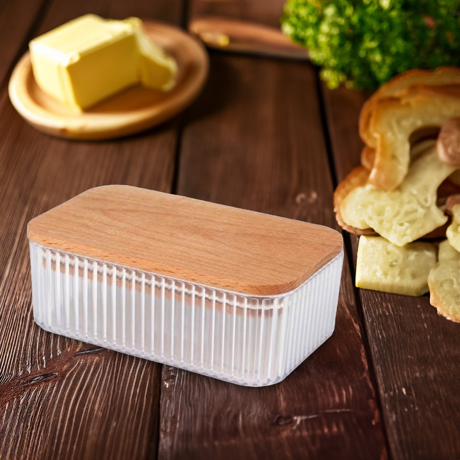 The Samba Butter Dish is a versatile food storage box that keeps butter, cheese, and other small food items fresh. It features a transparent ribbed plastic base and a natural wooden lid, combining functionality with a stylish look.