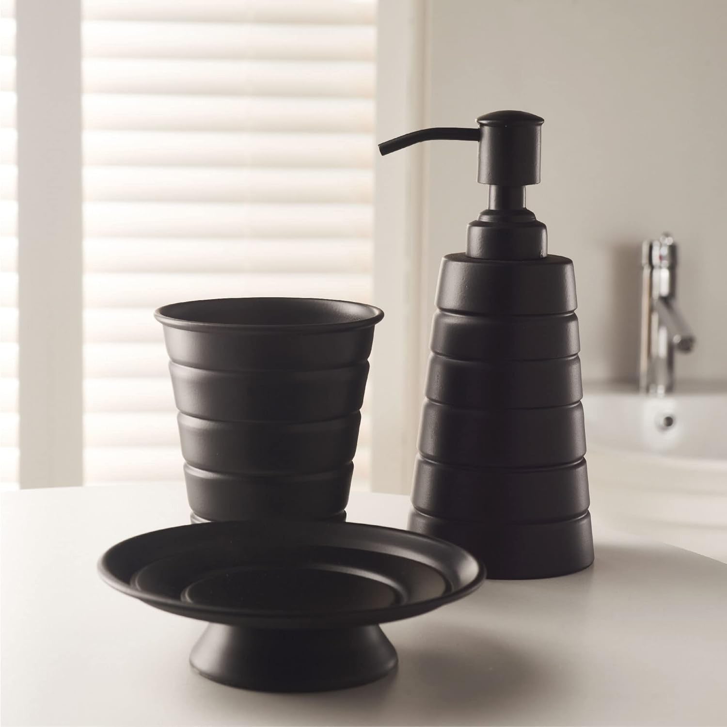 - Includes soap dispenser, tumbler, and matching soap dish.