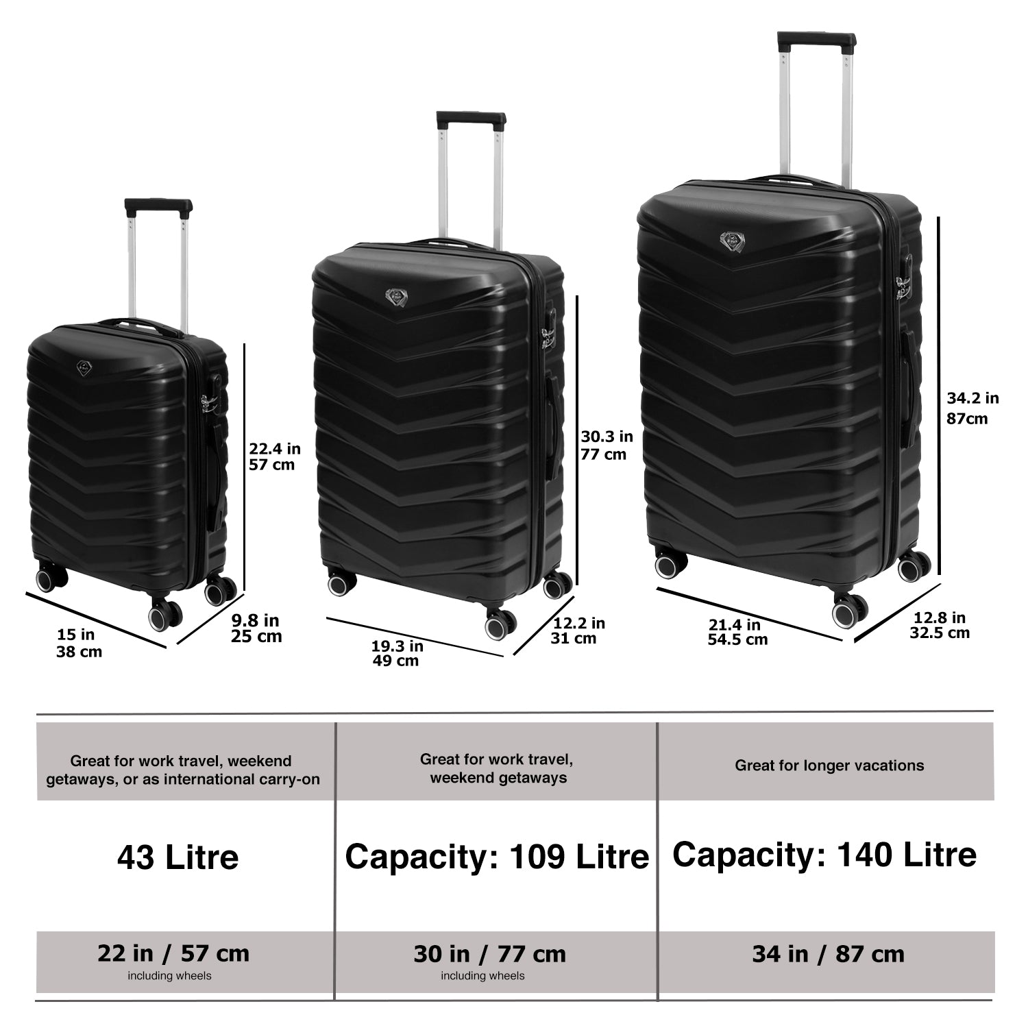 - 3-Piece Set: Includes 1pc 43-Litre Suitcase ( H: 57 x W: 38 x D: 25cm )/ 1pc 109-Litre Suitcase ( H: 77 x W: 49 x D: 31cm ) / 1pc 140-Litre Suitcase ( H: 87 x W: 54.5 x D: 32.5cm )