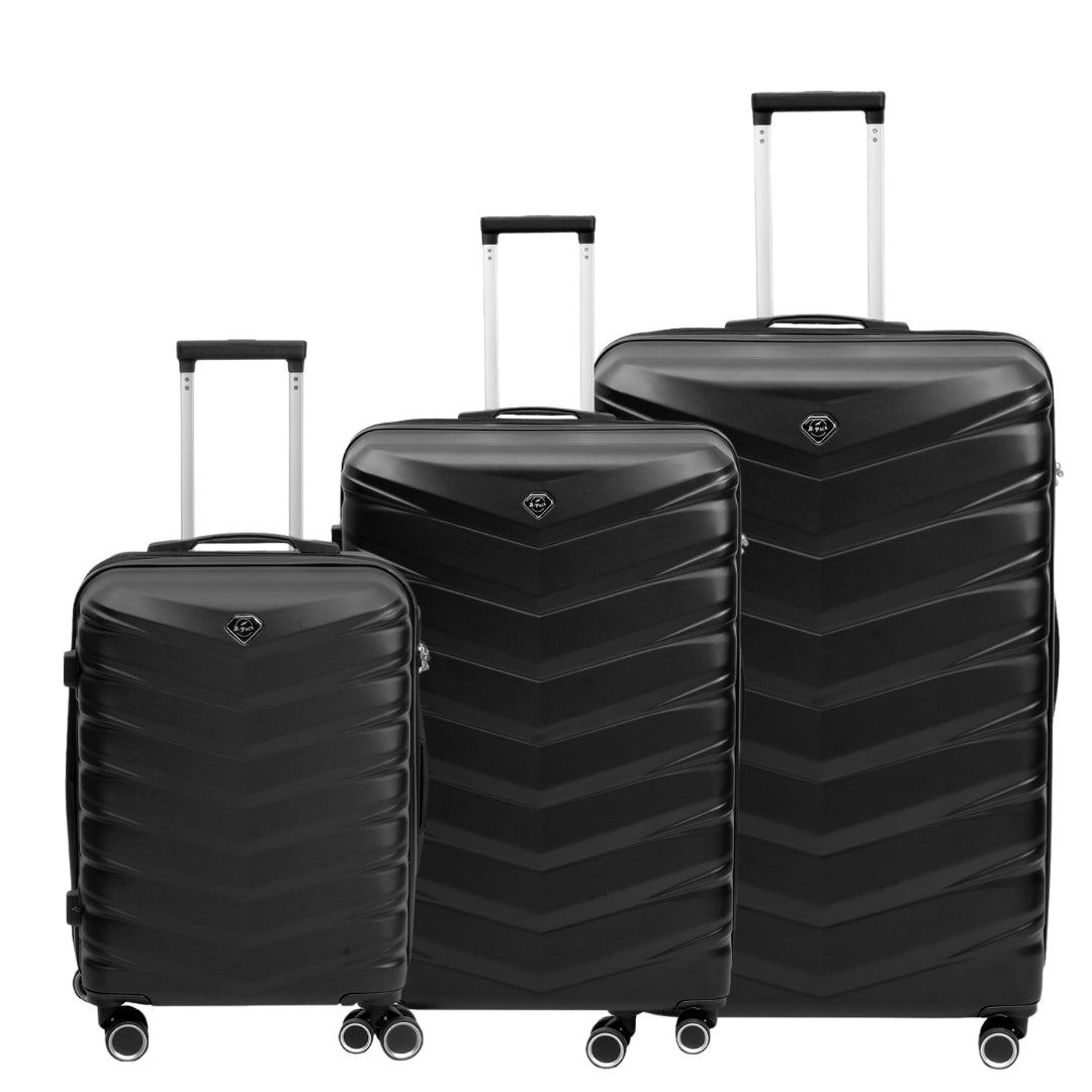 Travel in style with this elegant set of 3 black trolley case luggage. The set includes three sizes - 32", 28", and 20", perfect for long vacations, weekend getaways, or business trips. Constructed from robust ABS material with a chevron pattern, this luggage set is both fashionable and functional.