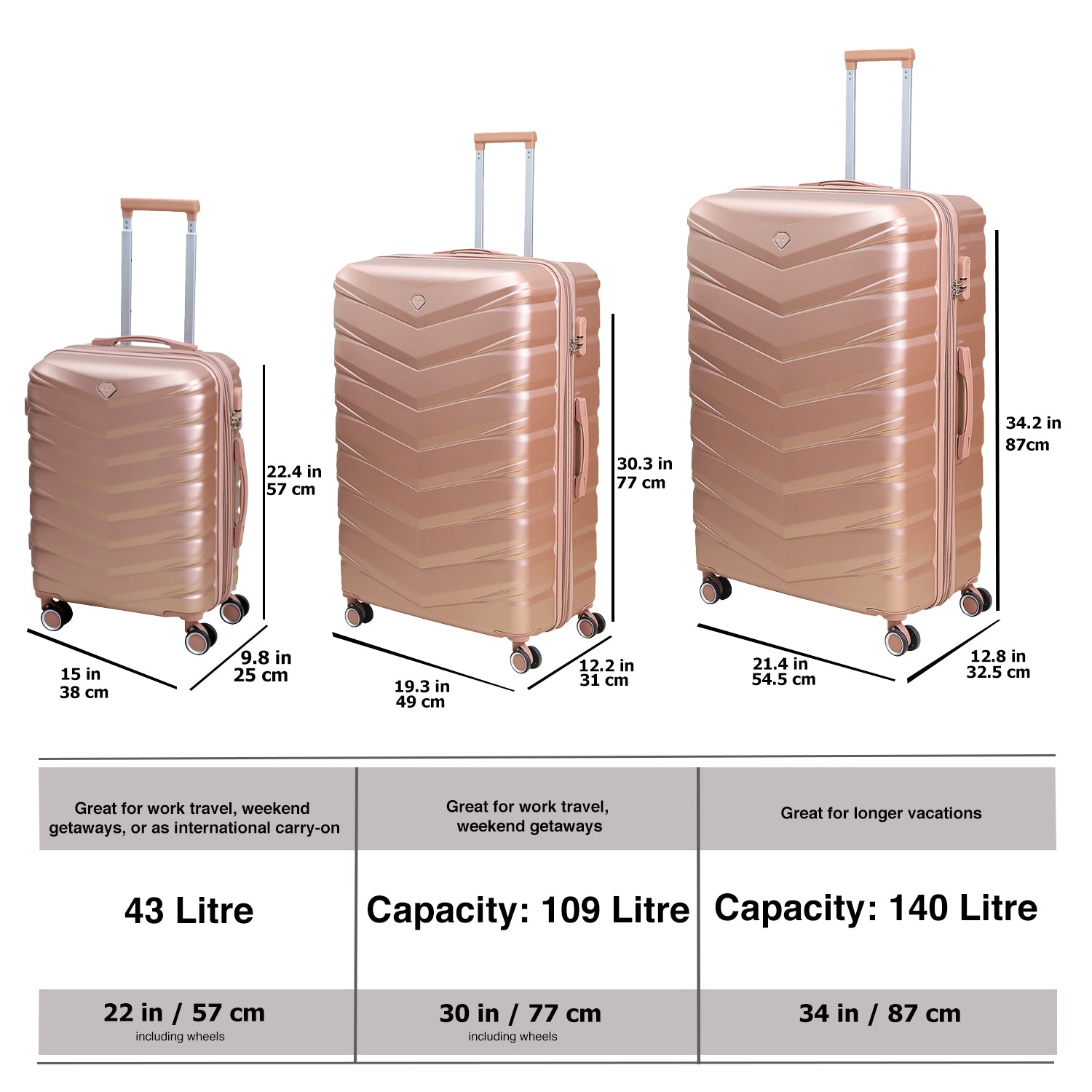 - 3-Piece Set: Includes 1pc 43-Litre Suitcase ( H: 57 x W: 38 x D: 25cm )/ 1pc 109-Litre Suitcase ( H: 77 x W: 49 x D: 31cm ) / 1pc 140-Litre Suitcase ( H: 87 x W: 54.5 x D: 32.5cm )