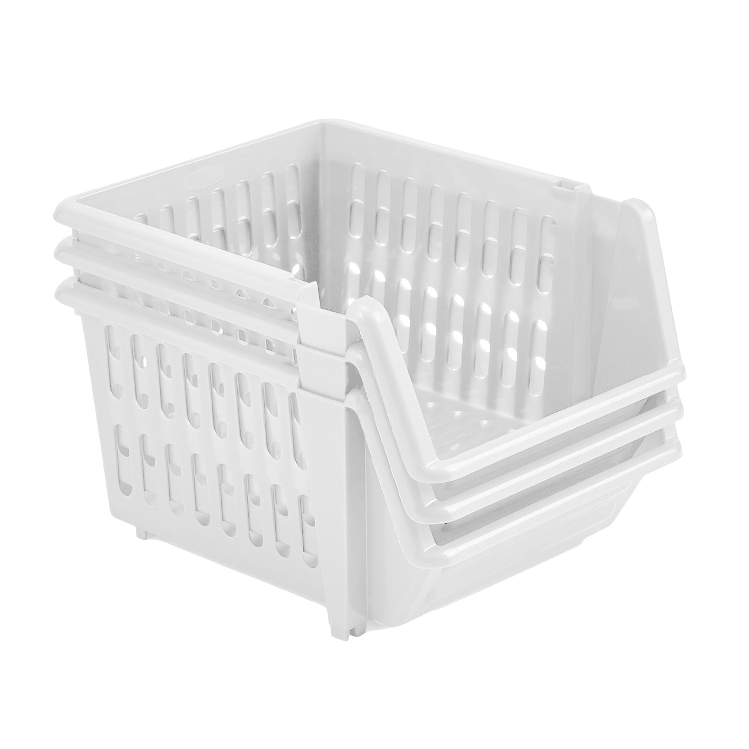 Set of 3 stackable baskets ideal for saving space in your kitchen or pantry for different items.