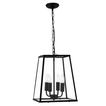 This Lantern Noir tapered 4 light lantern with clear glass panels has a simple, classic look. The matt black tapered shade has four clear glass panels, which house an attractive four candle style light fittings positioned centrally, providing a bright source of light for any room. And the shade hangs elegantly from the ceiling by a slim black chain.