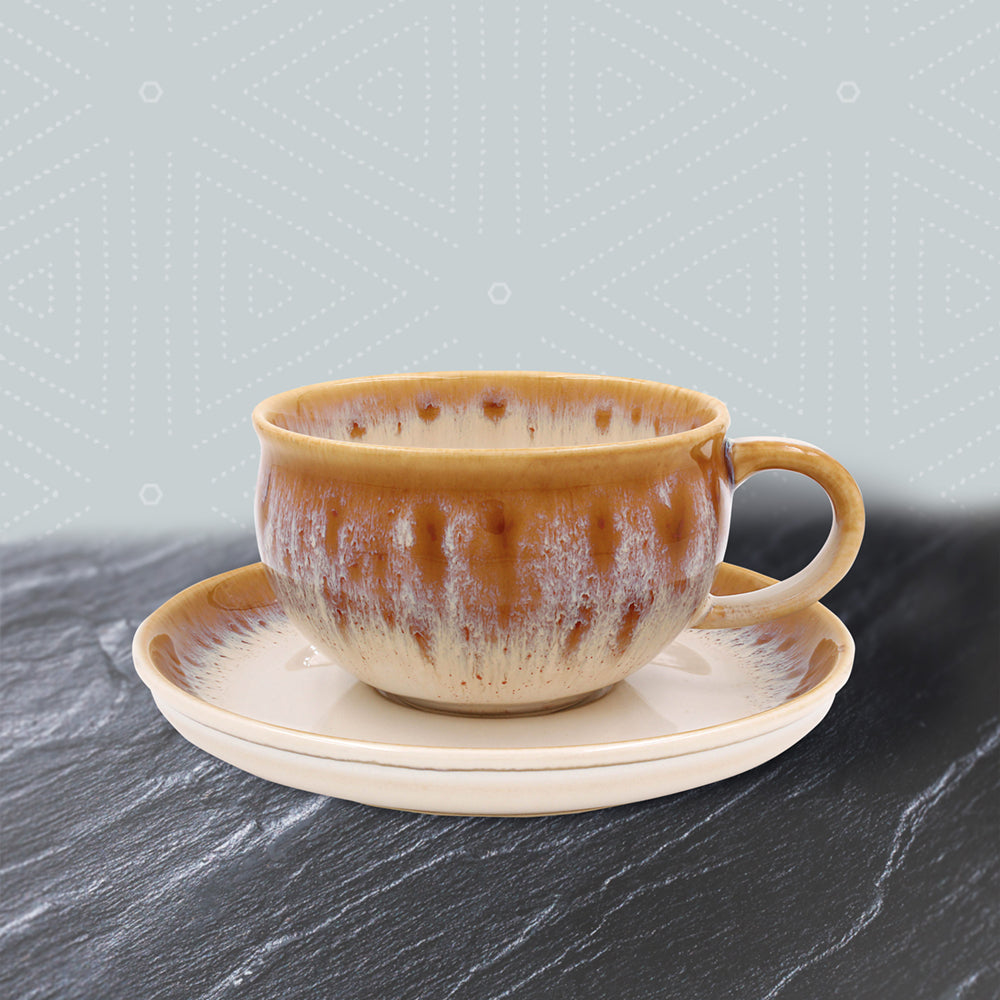 Upgrade your coffee moments with this Coffee Cup and Saucer Set, crafted from premium stoneware and finished with an elegant speckled ombre design in a stunning reactive glaze. The set includes a 4-piece rounded cup with a comfortable handle and 4-piece matching saucer, perfect for rustic and modern themes.