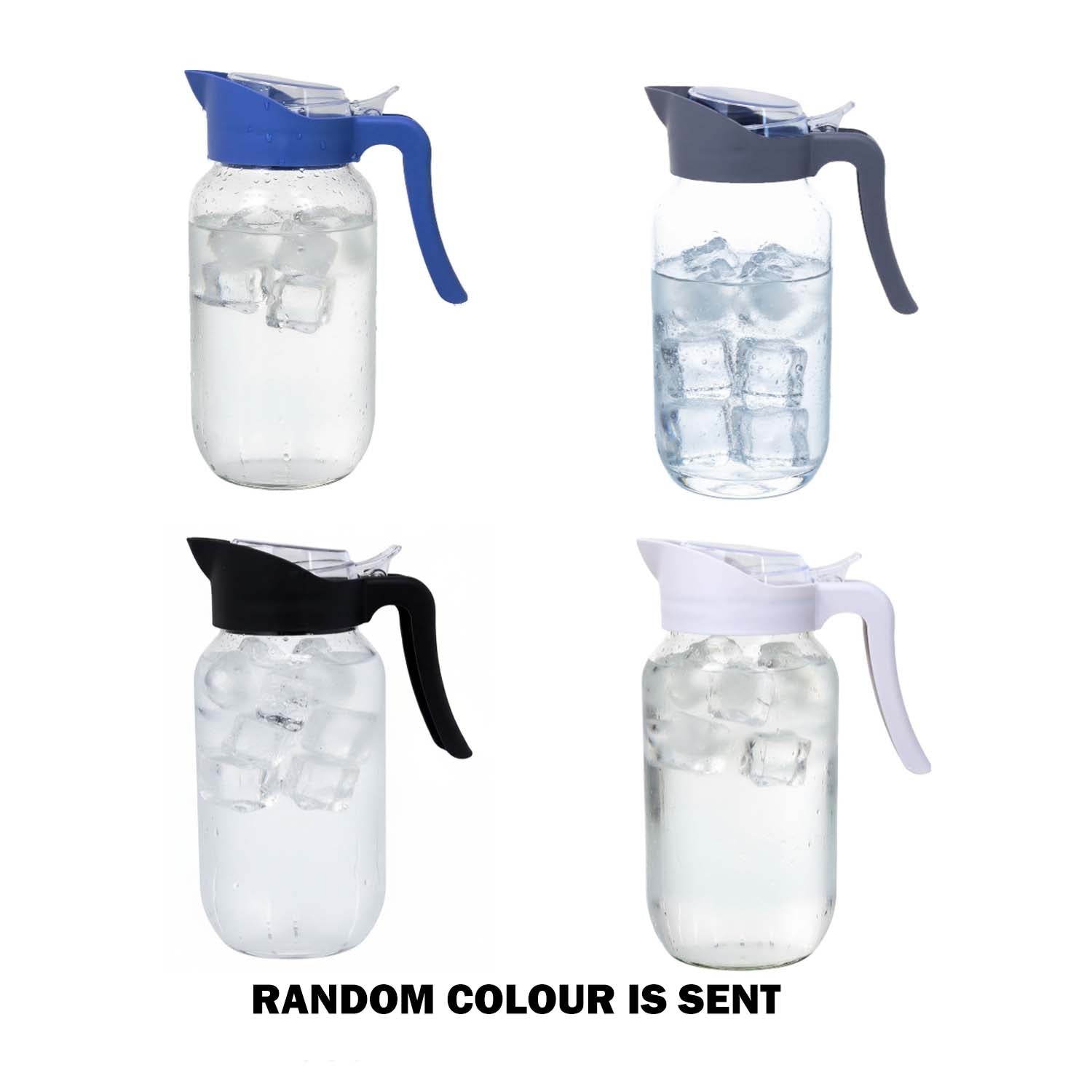 - Round body with a modern look; features a plastic lid, pourer, and handle in assorted colours—grey, black, white, blue. (random colour pitcher is sent).
