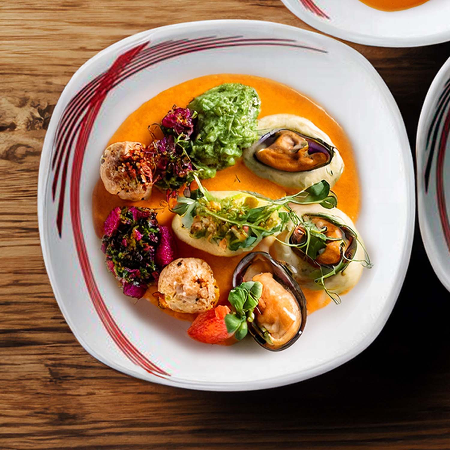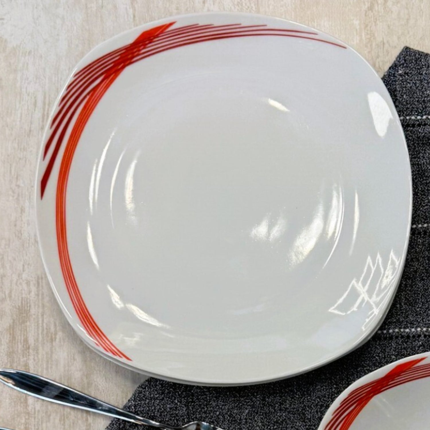 This 25cm porcelain dinner plate features a clean white with stylish curved red lines, adding a bold yet elegant accent to your dining table. Its square shape offers a contemporary look while providing ample space for a variety of meals.