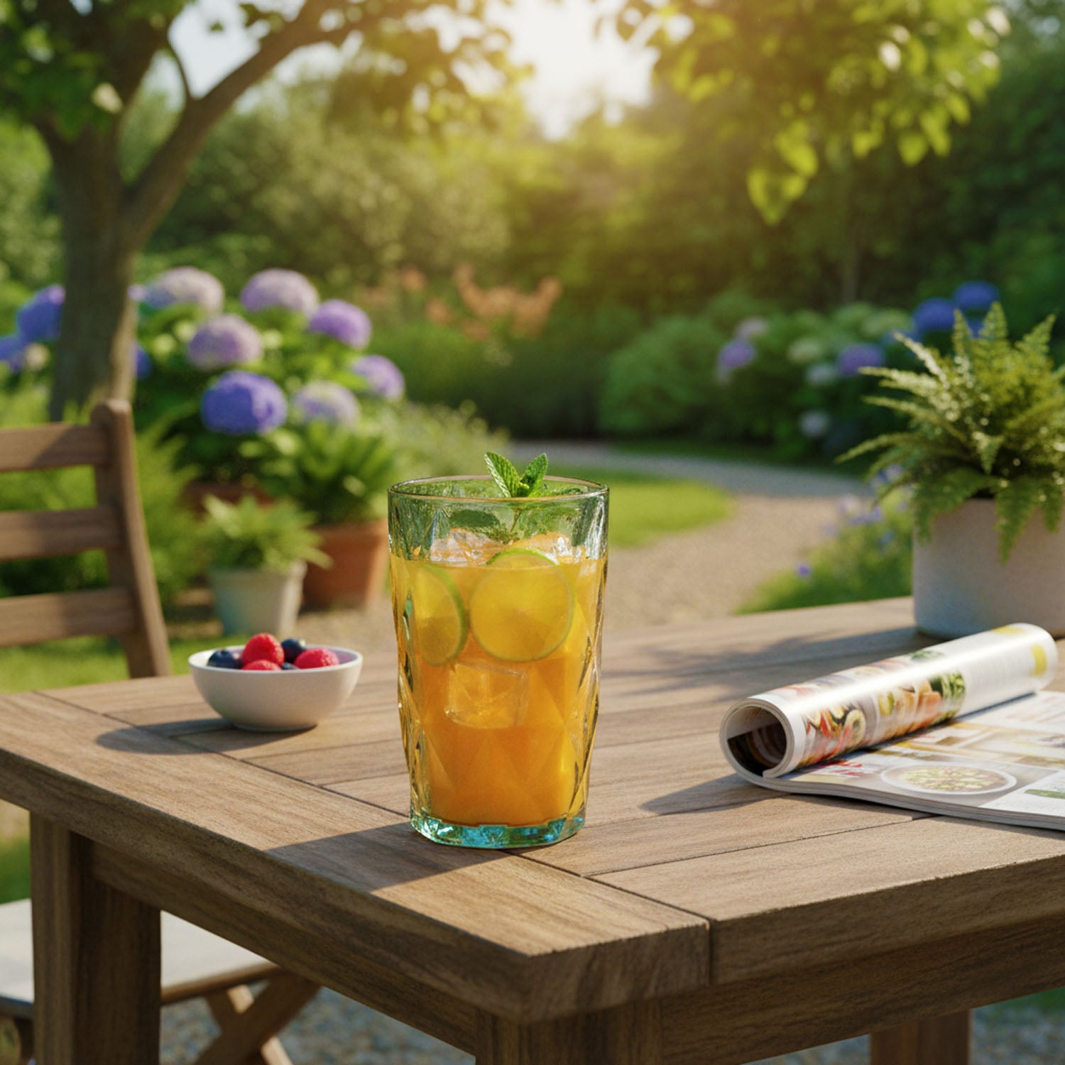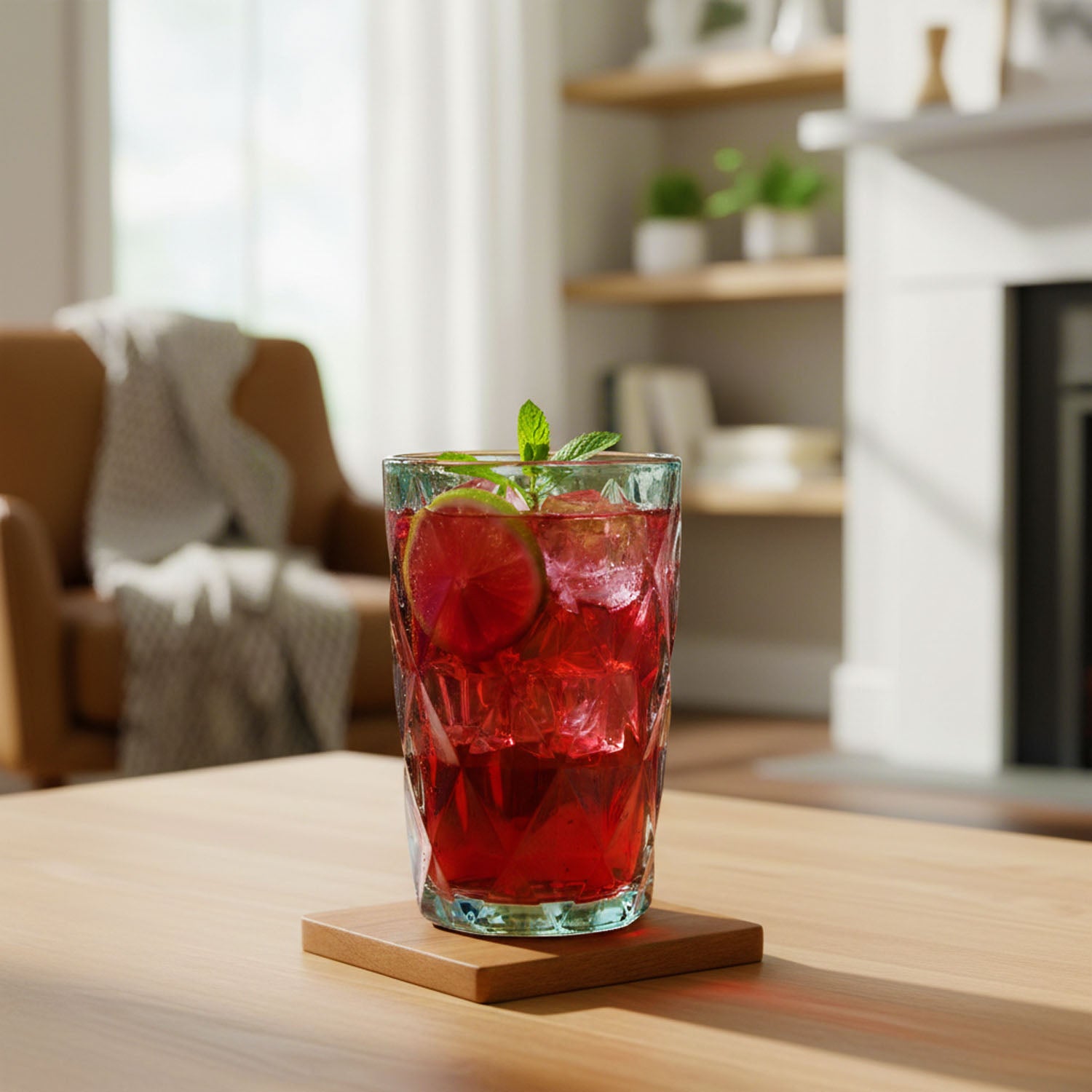 This 350 ml glass combines modern elegance with practical functionality. Featuring a geometric diamond-cut pattern, it adds a stylish touch to any table setting. Made from durable glass, it is ideal for serving water, juice, cocktails, or soft drinks. Its design ensures a comfortable grip and makes it suitable for both everyday use and special occasions.