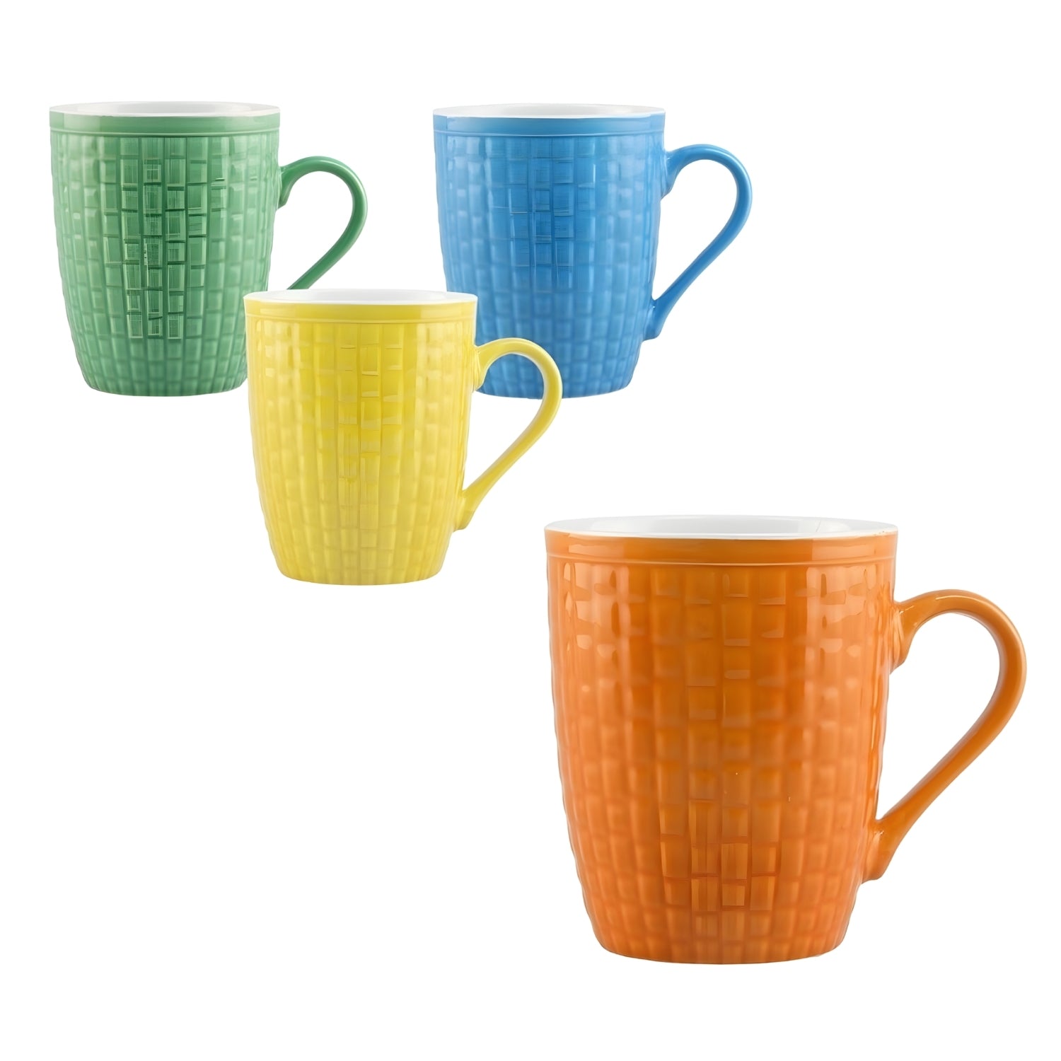 Add a splash of colour to your kitchen with this set of 4 ceramic mugs in assorted vibrant shades: green, blue, yellow, and orange. Each mug features a stylish textured pattern and a smooth white interior, combining elegance with everyday practicality. Perfect for coffee, tea, or any hot beverage, these mugs are designed for convenience and durability.