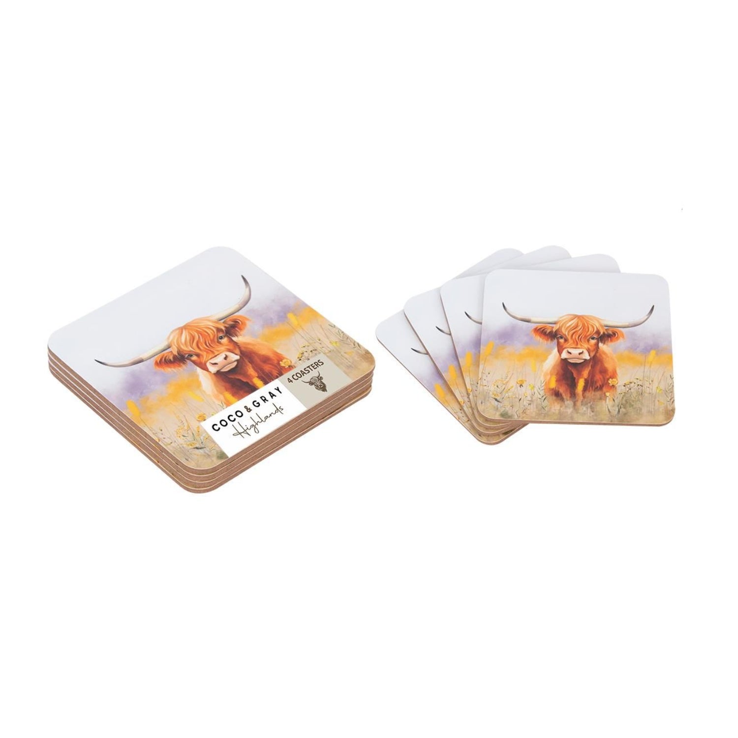 Bring countryside charm to your coffee table with this set of 4 Coco & Gray coasters, each showcasing an adorable Highland Cow design.
