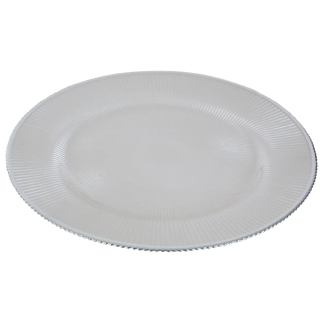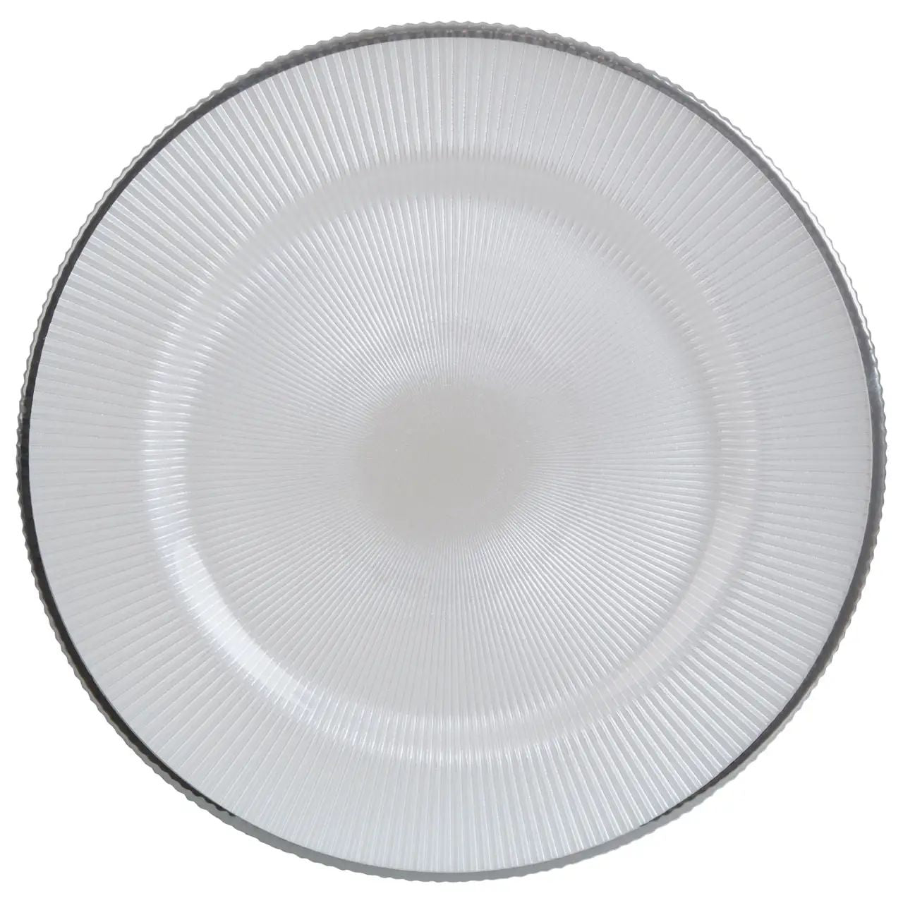 With embossed spiral texture, these white glass charger plates add sophistication to the dining table. The subtle design is complemented by a silver edge, enhancing its modern aesthetic.