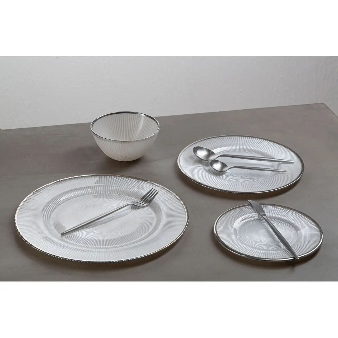 4Pcs Iva White Glass Embossed Silver Finish Rim Charger Plates