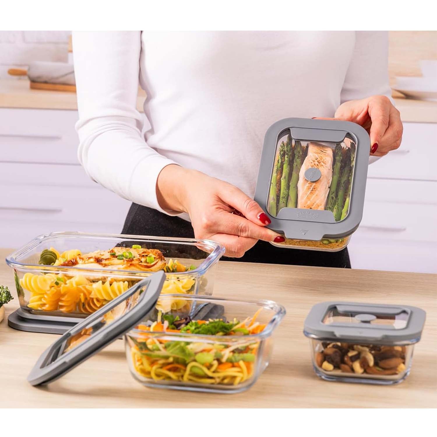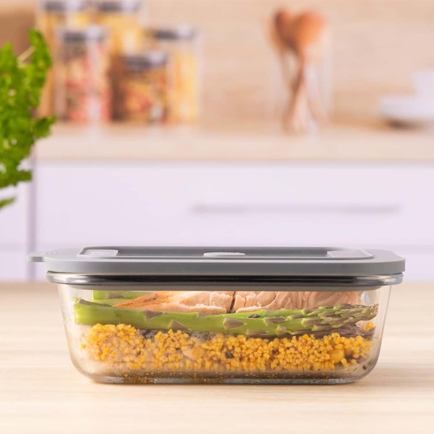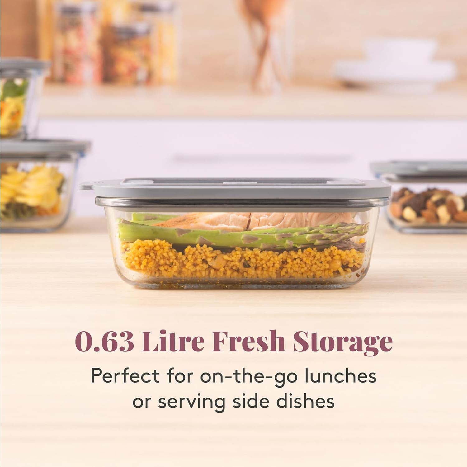 • 630ml capacity, rectangular shape with minimalist design, and features a grey airtight lid and silicone valve for freshness.