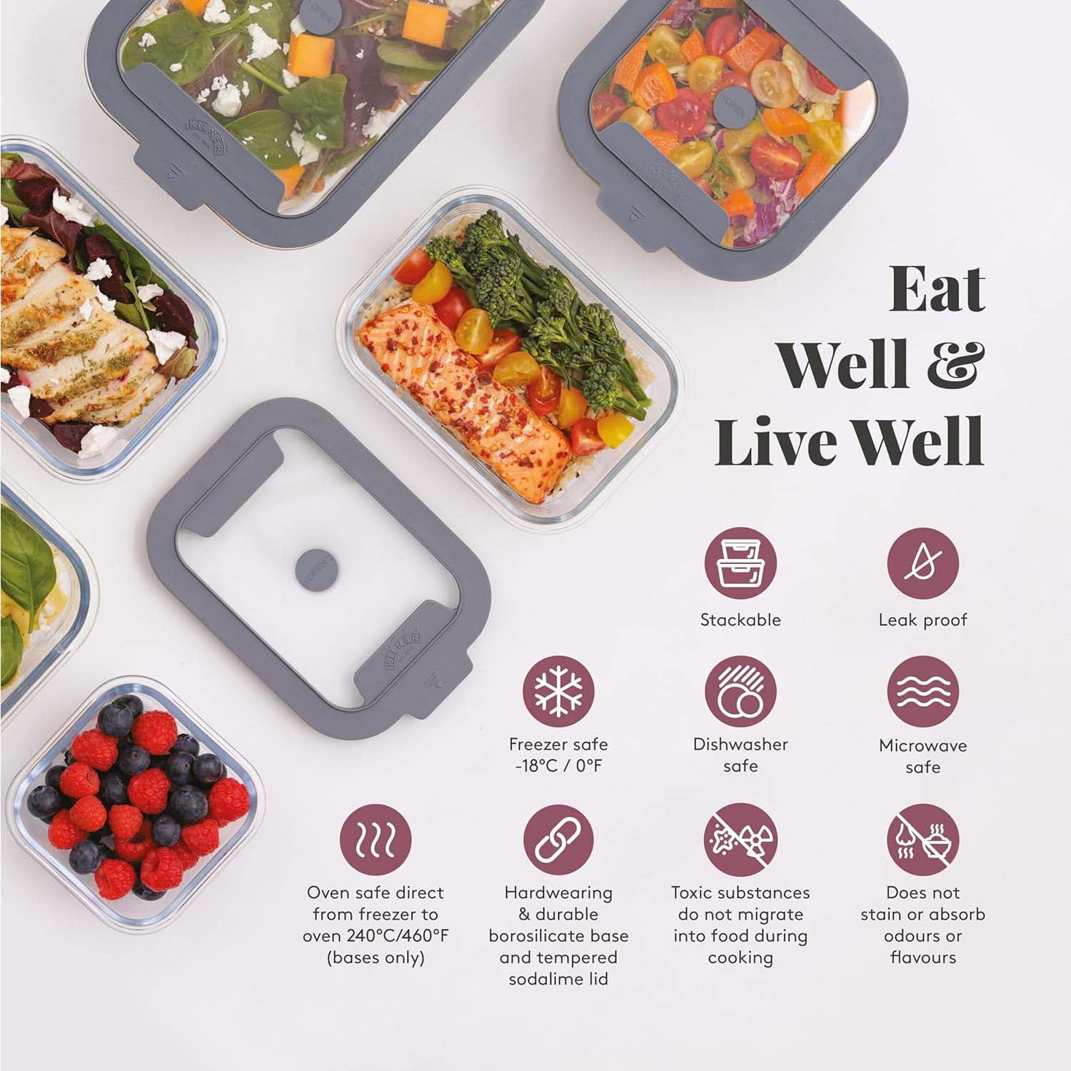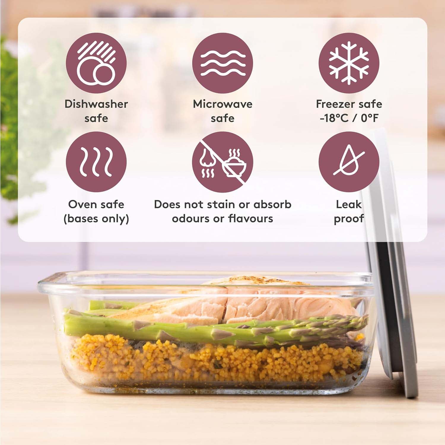 • Leakproof and safe for dishwasher, microwave, freezer, and oven (base only); resists stains, odours, and flavours.
