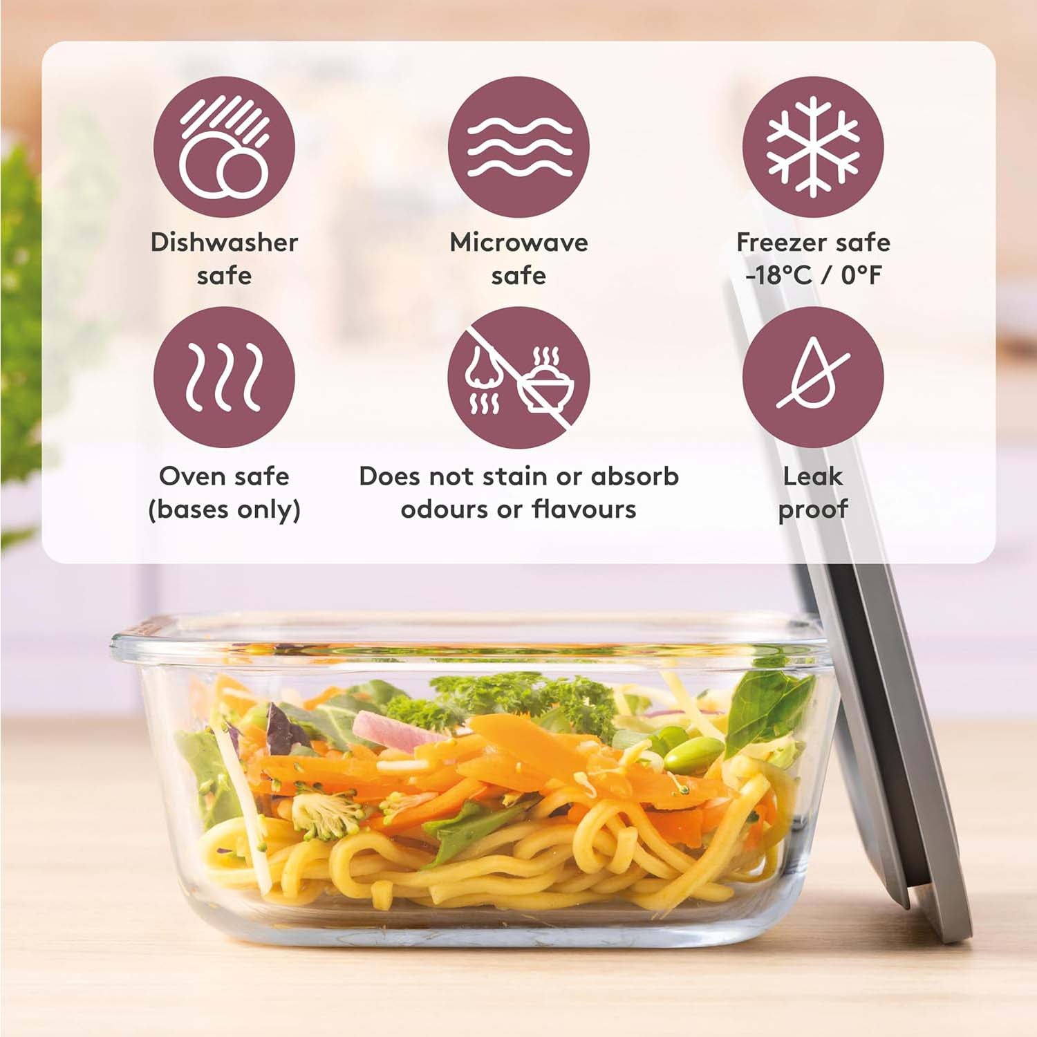 - Leakproof and safe for dishwasher, microwave, freezer, and oven (base only); resists stains, odours, and flavours.