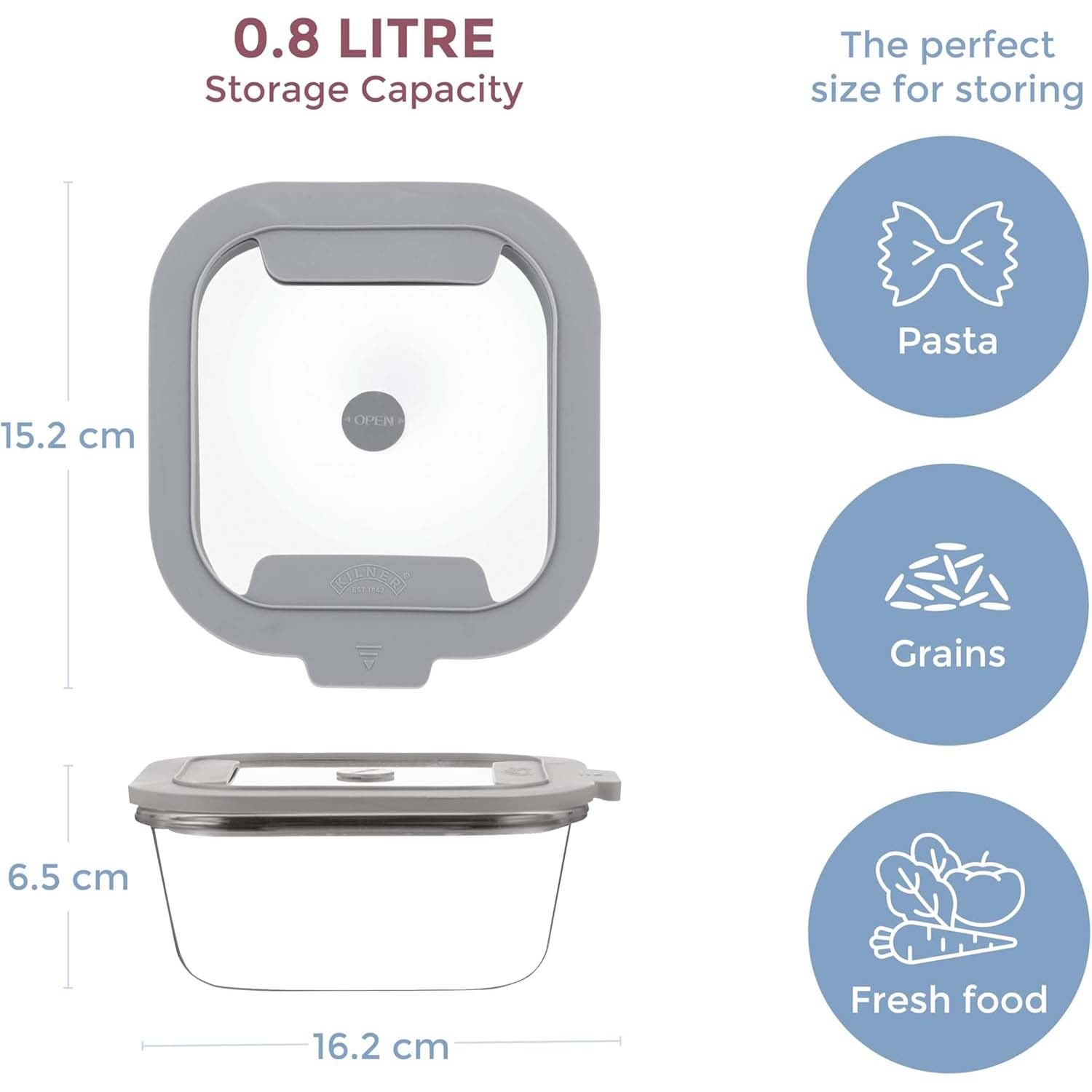 - 800ml capacity and features a square shape with minimalist clear base and grey airtight lid featuring a silicone valve.