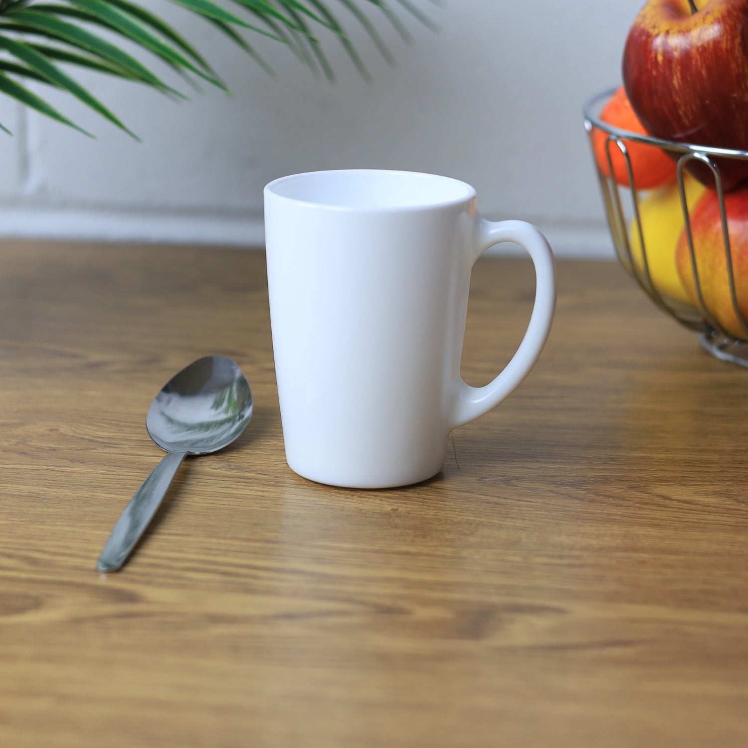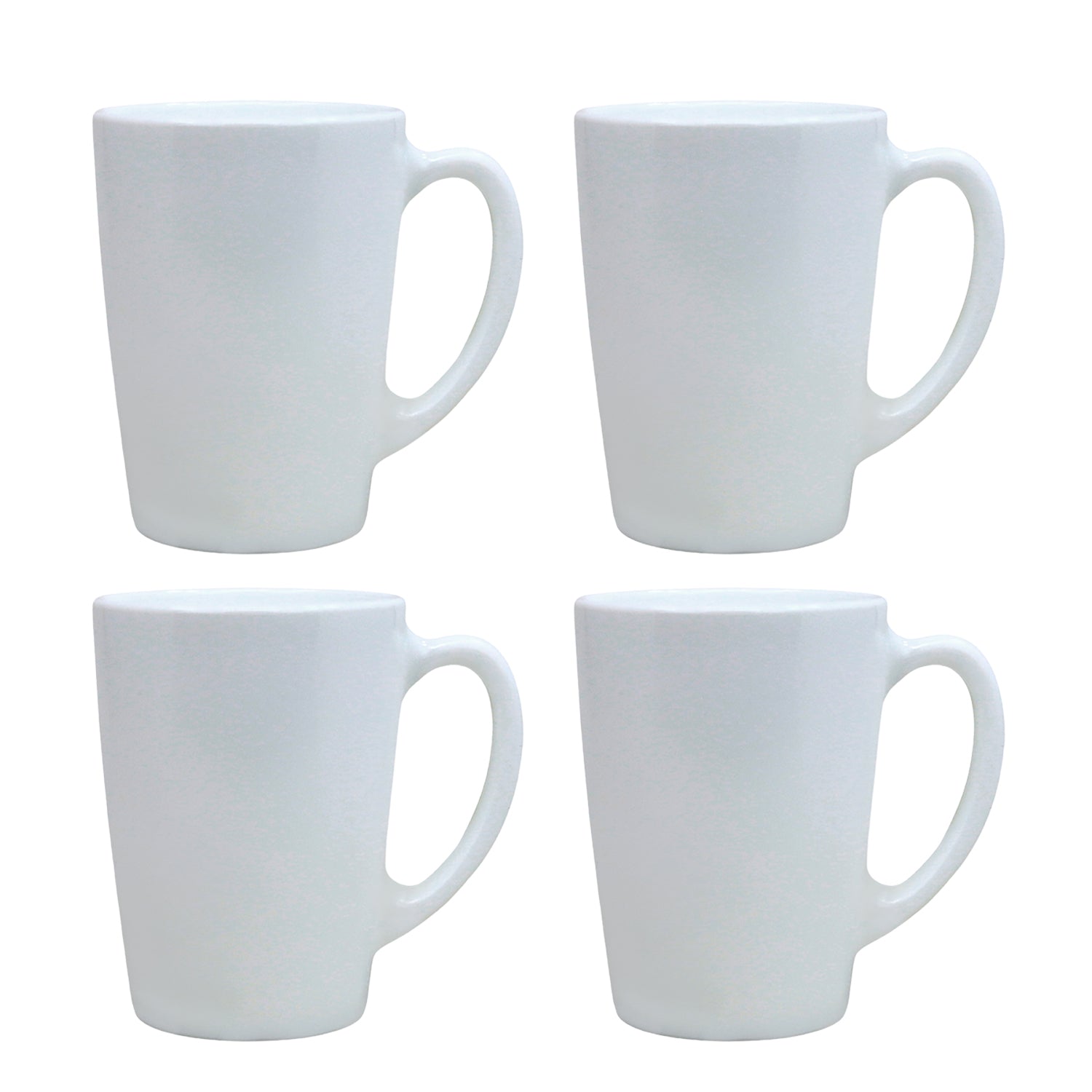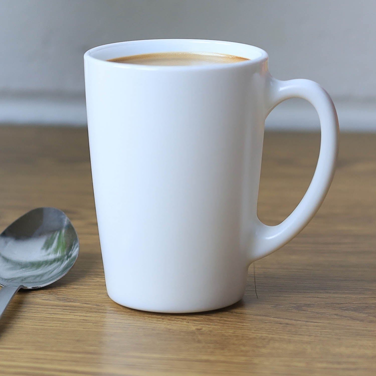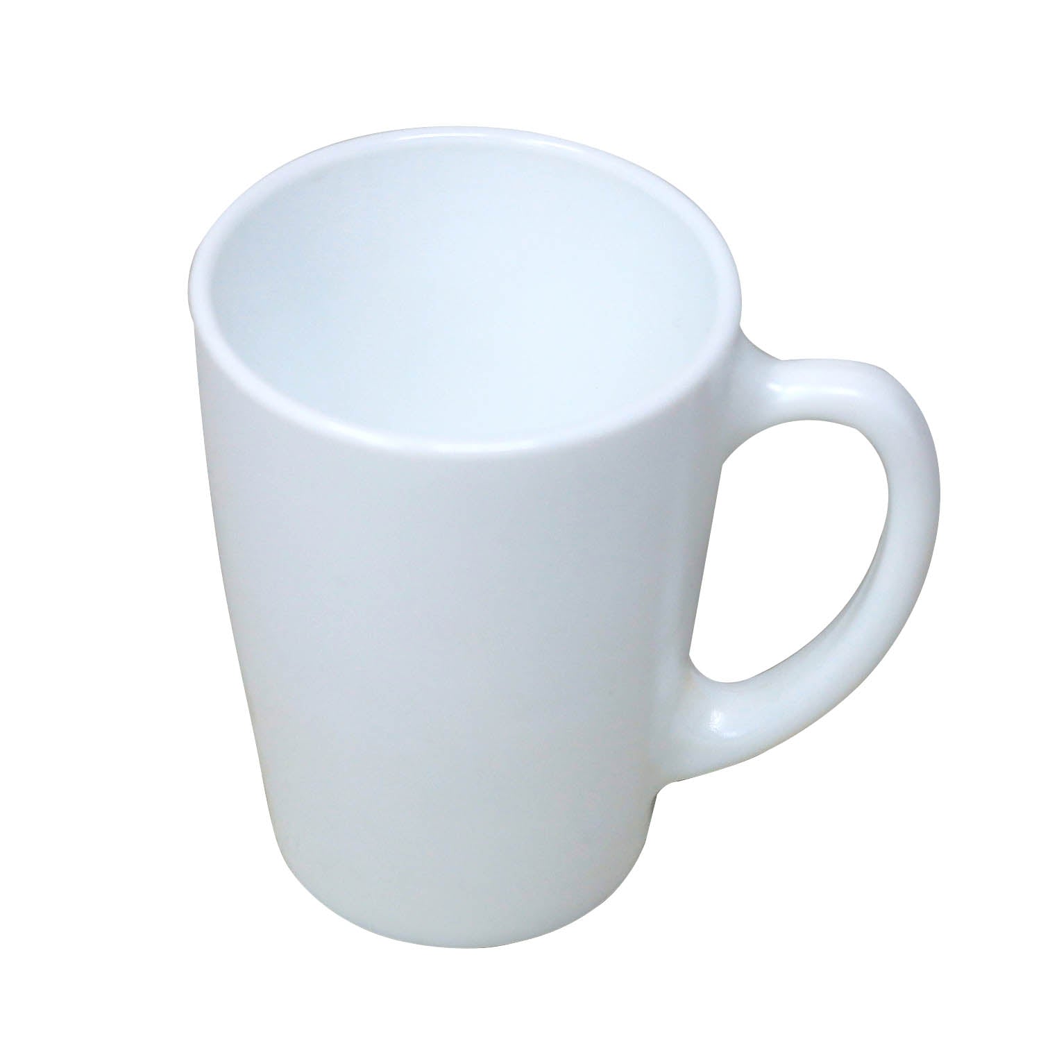 - Made from strong white opal glass in a simple cylindrical mug design with ergonomic handle; plain white for a clean, modern look.