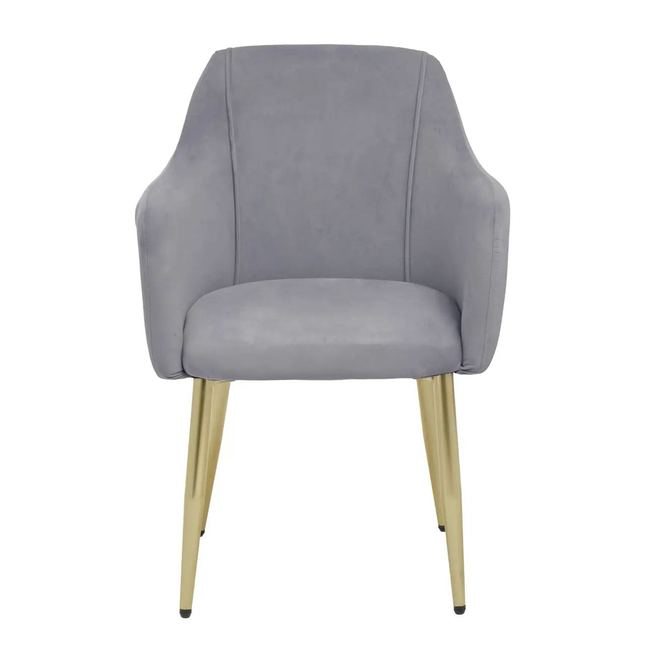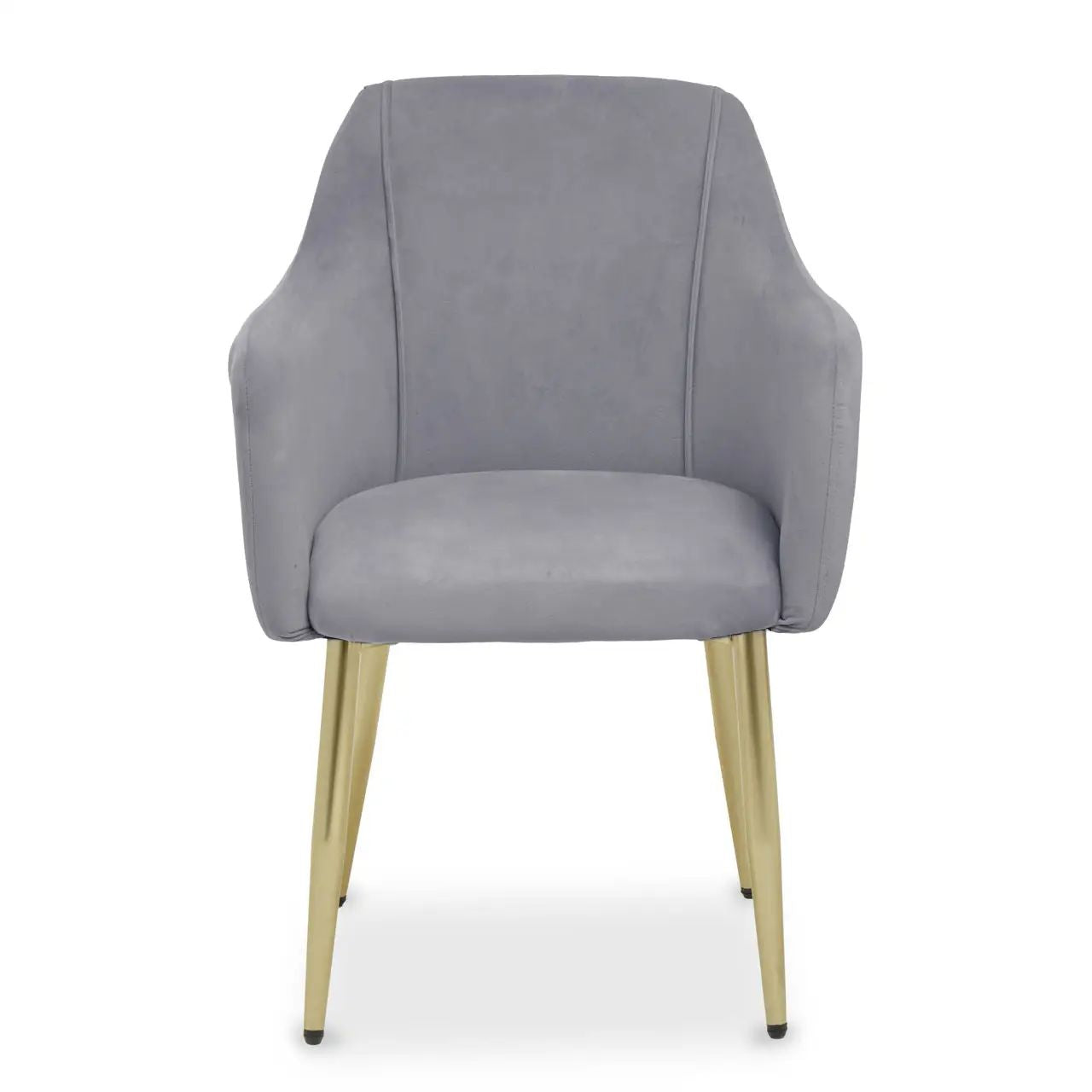 Smooth grey velvet cushions the foam-filled seat, back, and raised arms of these dining chairs. Stability is augmented by brushed gold-finish legs, adding a touch of luxe glamour to its contemporary design.