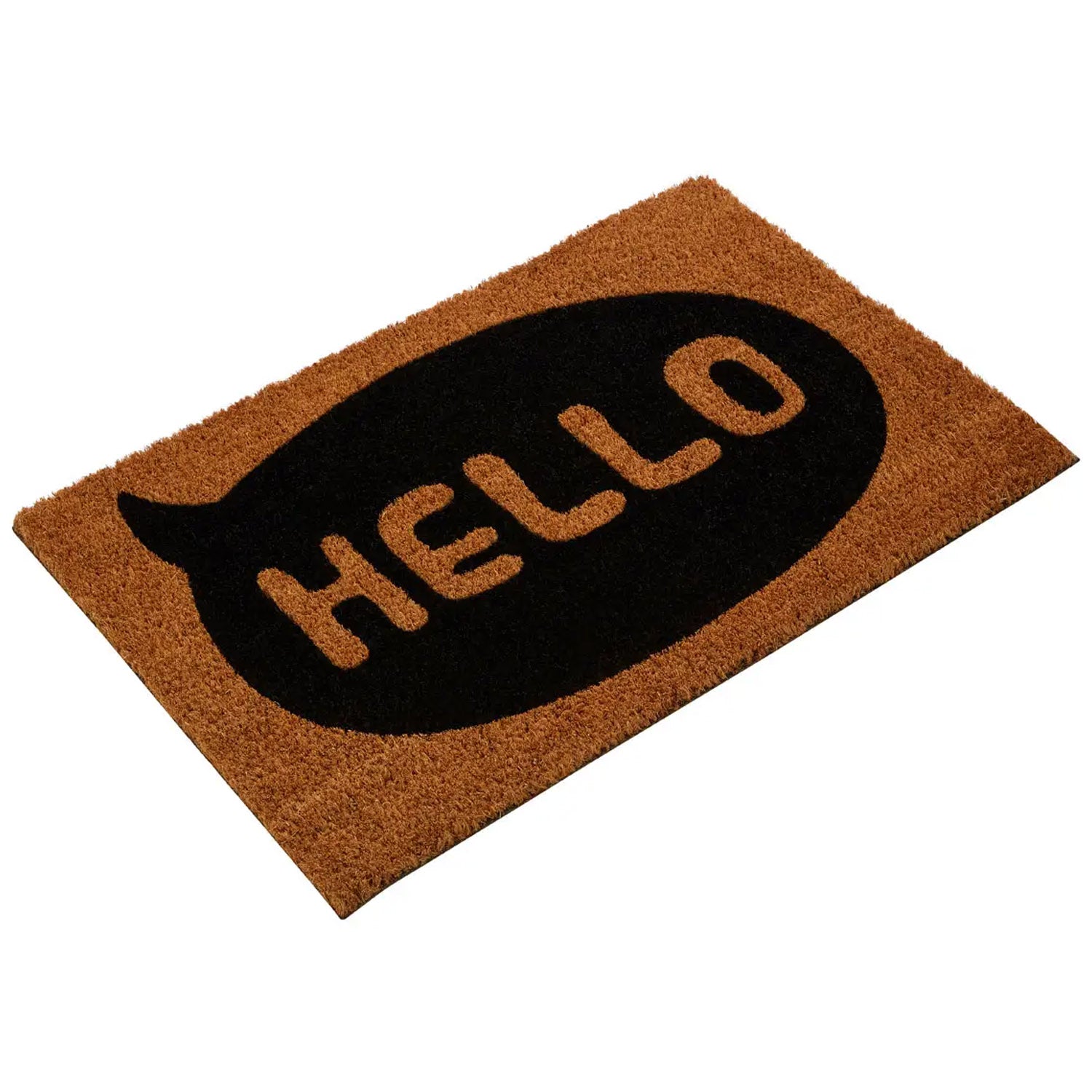 Ensure no dirt is trailed through your home by using our durable 'hello' doormat that features robust coir for tough cleaning. A PVC back will protect your floor when you are using the doormat. The design features natural coir and a black speech bubble with worded 'hello' detail in the middle, so it will look fantastic at your front or back door. Suitable for everyday use, you can welcome everyone into your home, but ensure they wipe clean their footwear first so you don't need to be following everyone with a brush.