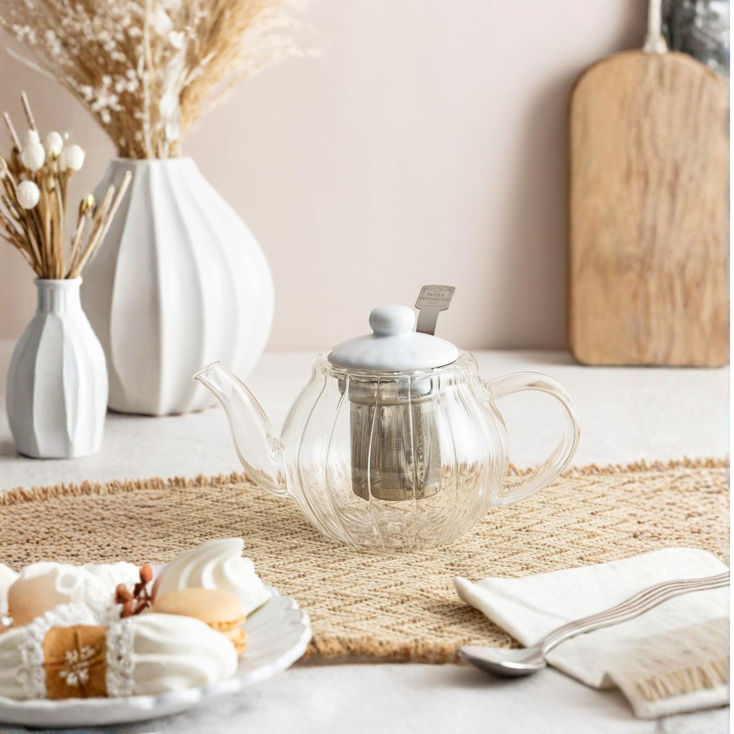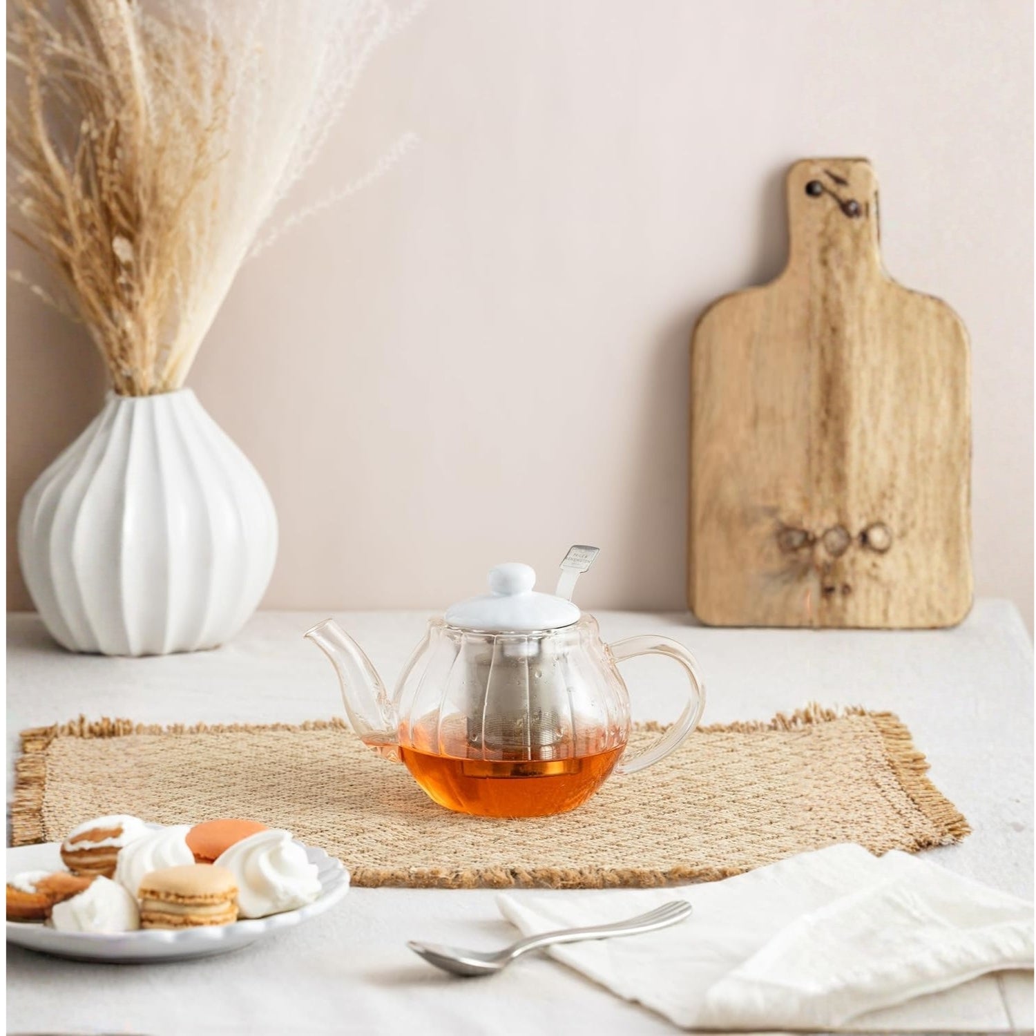 Enjoy a refined tea experience with this fluted embossed glass teapot featuring a white ceramic lid and stainless steel infuser. Crafted from heat-resistant glass, it allows you to watch your tea brew to perfection while adding a touch of elegance to your kitchen or dining table. Ideal for both loose-leaf and bagged teas, this teapot combines functionality with timeless style, making it perfect for any tea lover.