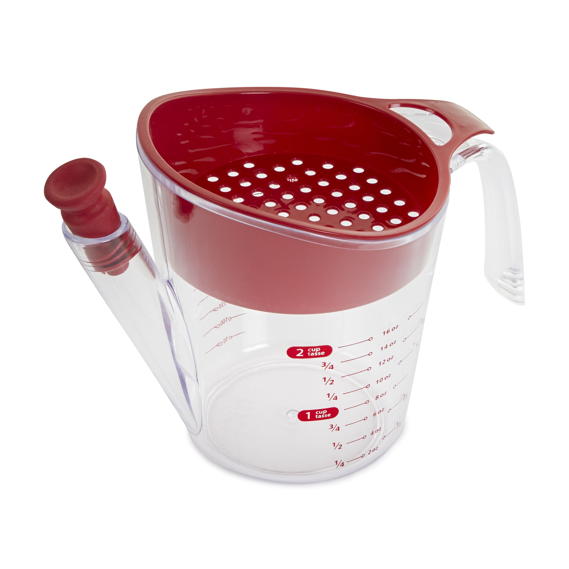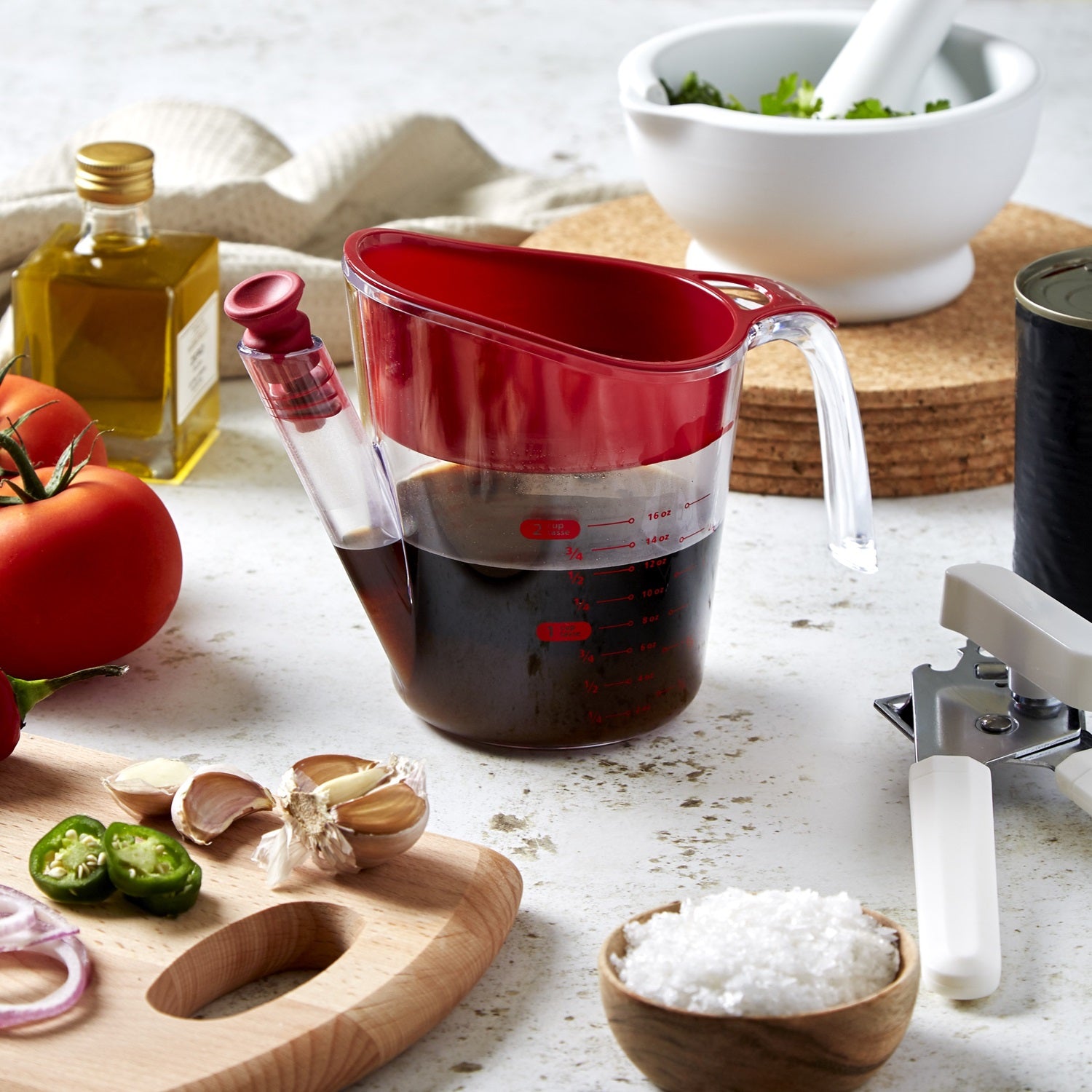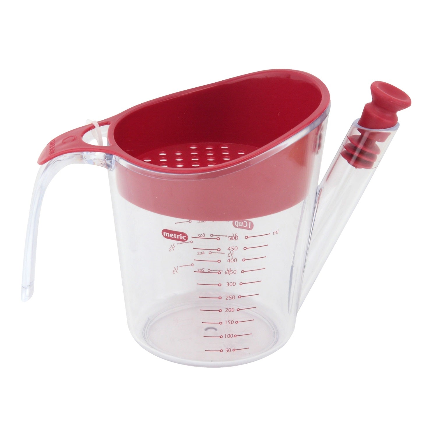 Make healthier gravies using this fat separator. Simply pour your gravy, roast drippings or soup stock through the top strainer and within minutes the oily fat will rise to the top leaving you with a liquid separated from fat and oil. Once separation has occurred, use the thumb trigger to dispense the liquid leaving behind any unwanted fat and oil in the measuring cup for disposal. Both heat resistant and shatterproof, perfect for hot and cold liquids. Approx. Product Dimensions: 18 x 10 x 14 cm.