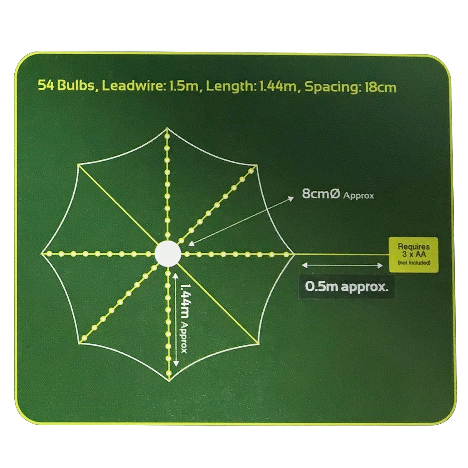 Illuminate your garden table with these LED parasol lights. Contains 6 strings of lights with 9 warm white LED bulbs per branch. Powered by a waterproof battery box with an automatic timer function (6 hours on / 18 hours off). Features 8 light sequences to choose from including a flash effect. Suitable for indoor and outdoor use. Requires 3 x AA batteries (not included). Non-Replaceable LED lights.