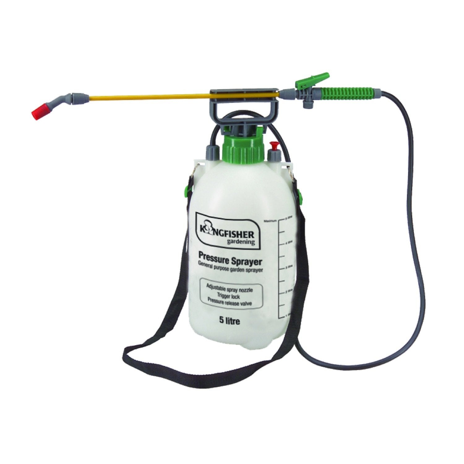 5L general purpose garden sprayer. Shoulder strap adjustable spray lance and trigger lock. Includes safety pressure release valve. Individually shrink wrapped.Manufactured from shatterproof and frost resistant material.