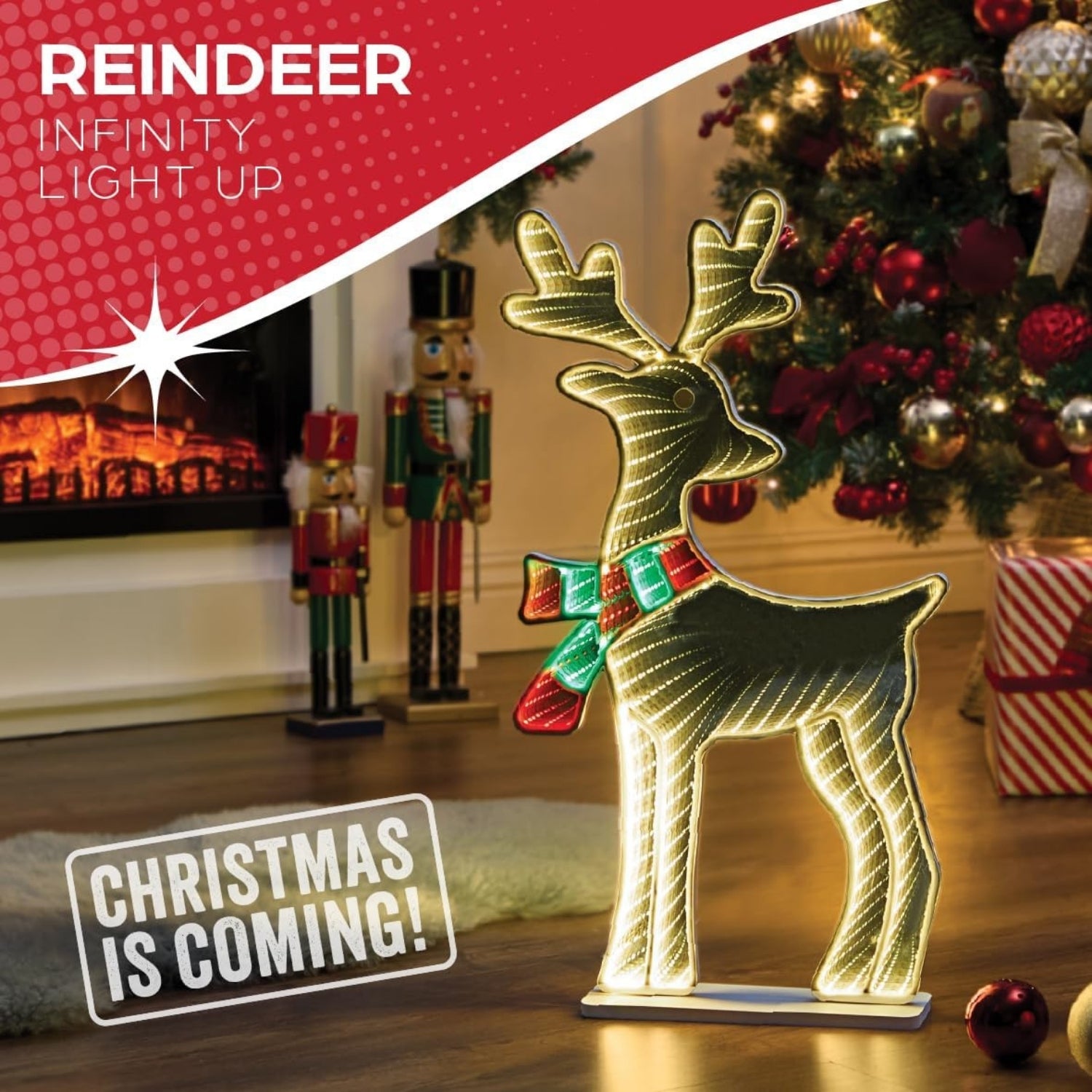 - Large 60 cm reindeer silhouette with striking infinity mirror LED design.